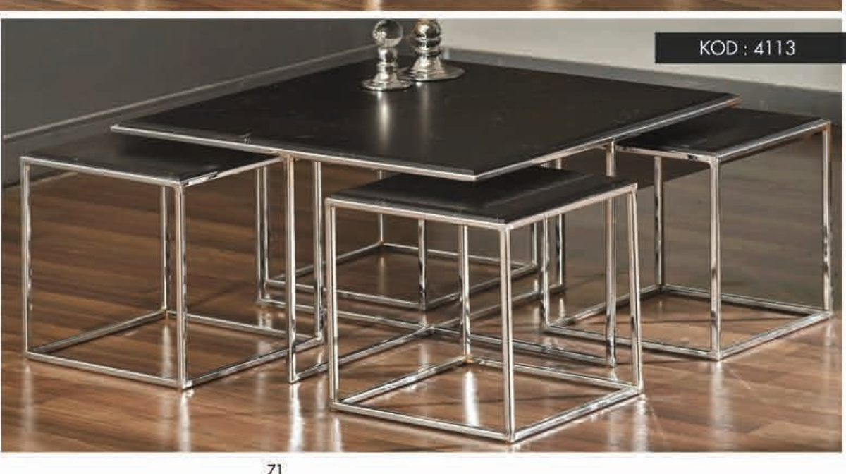4113 Gümüş Ayaklı Siyah Orta Sehpa, şıklığı ve işlevselliği bir arada sunarak, salonunuza modern bir hava katar. Çelik Kardeşler VIP’nin sunduğu elden taksit fırsatları ile bu özel masa takımına kolayca sahip olabilir, evinizde kalite ve estetiği buluşturabilirsiniz.