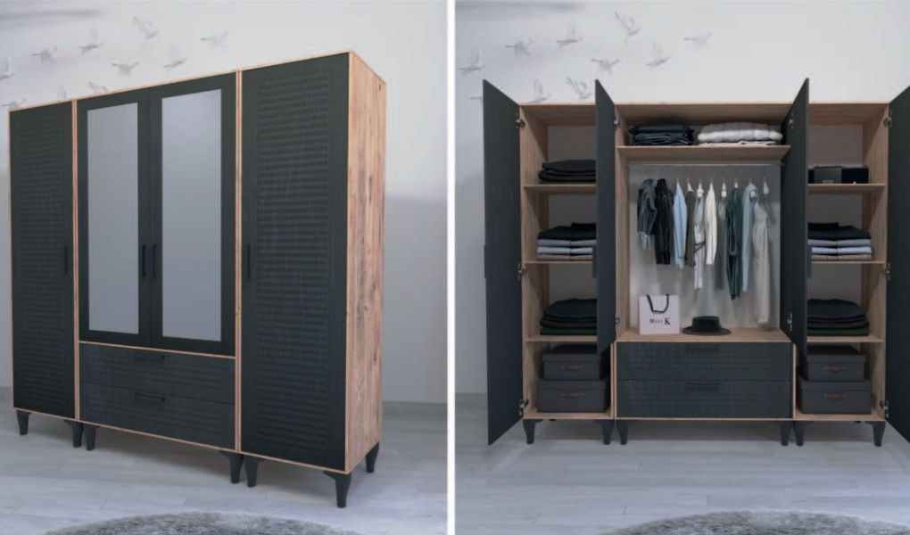 Modern ve geniş saklama alanıyla Armoni Dört Kapılı Ceviz AntrasitDolap, odanıza hem şıklık hem de düzen getiriyor! Gençlerin ve yetişkinlerin eşyalarını rahatça saklayabileceği bu dolap, işlevselliğiyle odanın en dikkat çekici parçası olacak. Geniş rafları ve asma bölmeleri sayesinde kıyafetler, aksesuarlar ve daha fazlası için ideal depolama alanı sunar.