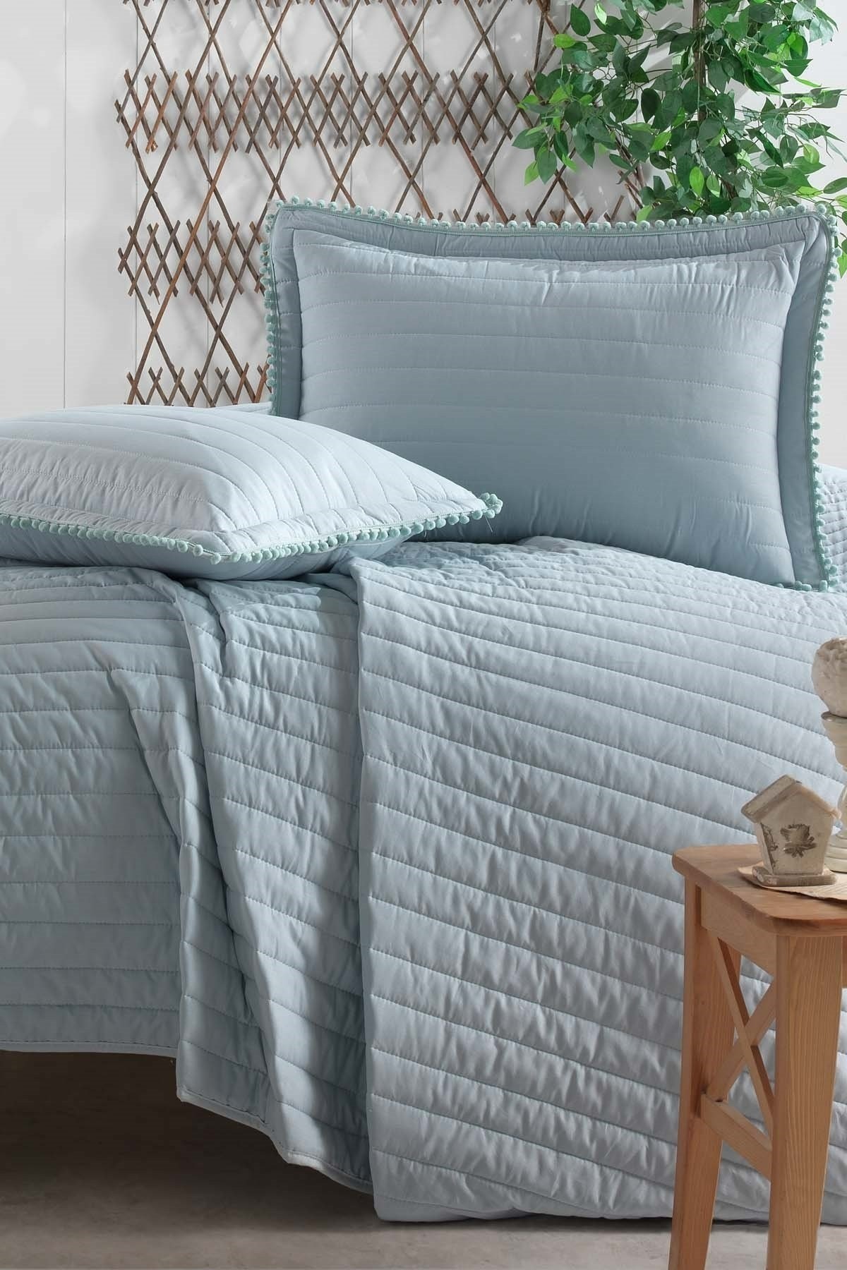 Clasy Tek Kişilik Pamuk Yatak Örtüsü Seti, zarif ponpon detayları ve canlı rengiyle yatak odanıza enerji katar. Fonksiyonelliği ve sade şıklığıyla hem genç odaları hem de misafir odaları için ideal bir seçenektir.