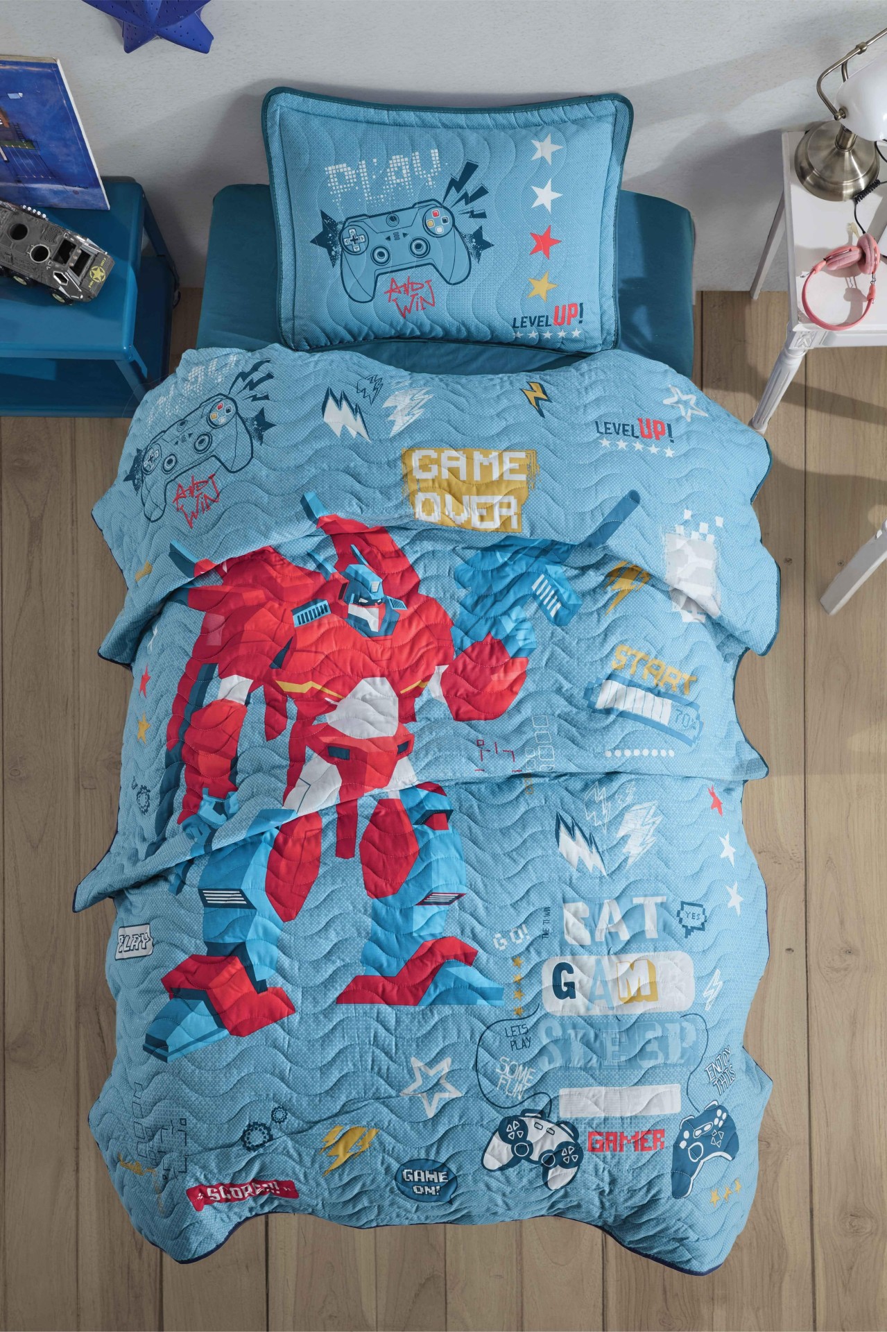 Clasy Game Over V1 mavi yatak örtüsü seti, tek kişilik pamuk dokusu ile hem sağlıklı bir uyku ortamı sağlar hem de genç odalarında eğlenceli bir atmosfer yaratır. Çelik Kardeşler VIP ayrıcalığıyla dört mevsim rahatlık sunar.