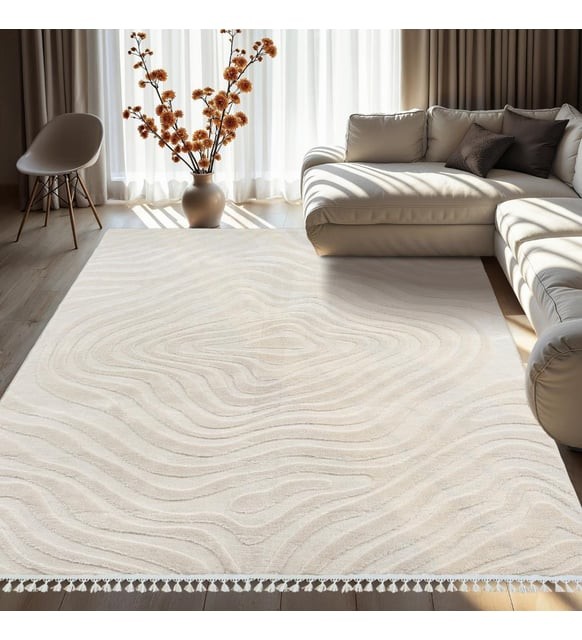 Dinarsu Alaçatı 190x290 püsküllü halı, %100 polyester dokusu, kaymaz tabanı ve zarif açık bej rengiyle şık ve konforlu yaşam alanları oluşturur.
