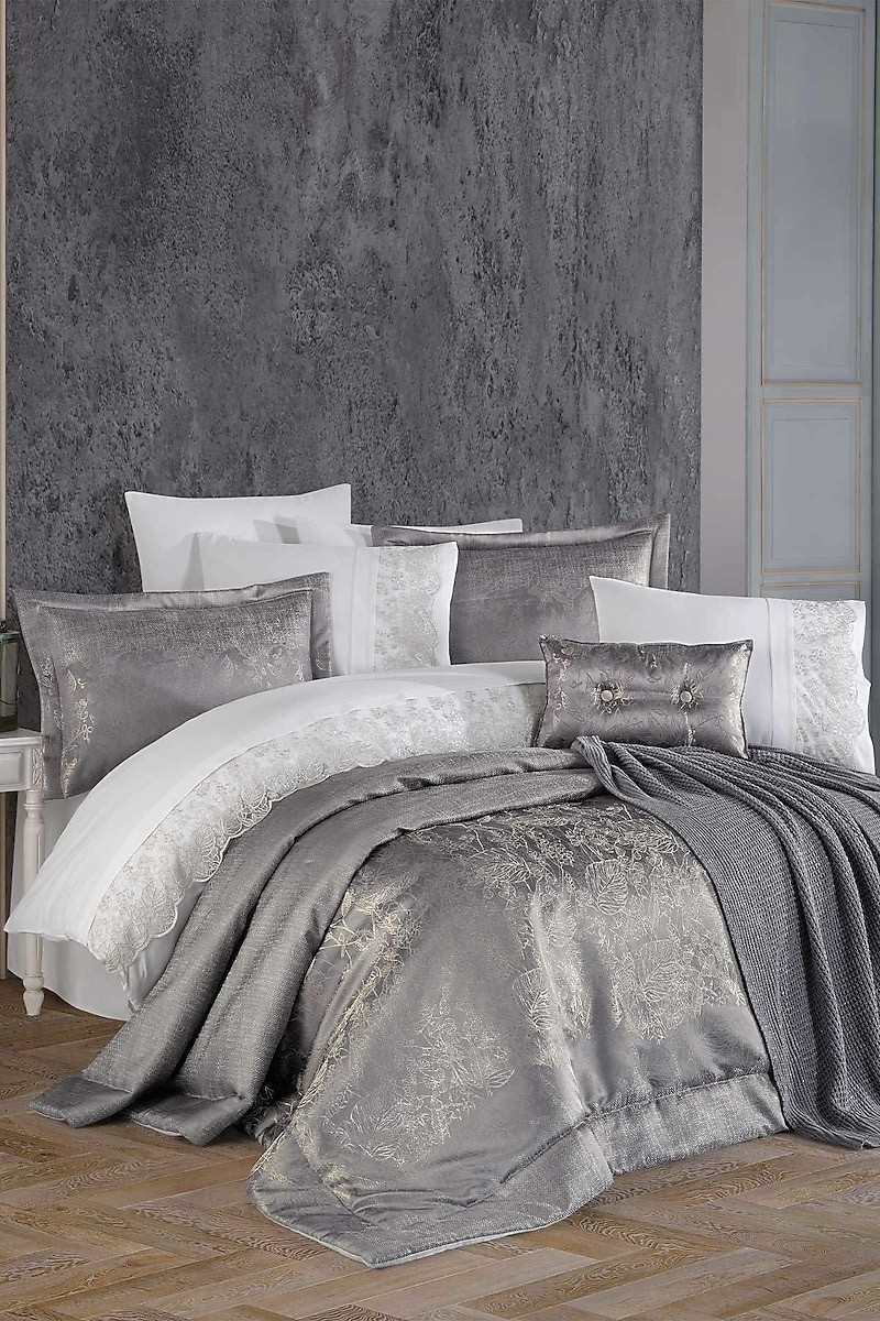 HesabımElart Alisha Gümüş 11 Parça Çeyiz Seti, görkemli gümüş tonları ve zarif taş işlemeleriyle modern çeyizlik anlayışını yeniden tanımlıyor. “Modern & şık çeyizlik ürünler” mottosuyla tasarlanan bu özel set, yatak odanıza ışıltı ve sofistike bir hava katarken, kaliteli kumaşları sayesinde konforlu bir kullanım deneyimi sunar. Pamuklu nevresim takımı terleme ve bakteri oluşumunu önleyerek sağlıklı bir uyku ortamı oluşturur. Yatak örtüsünü korumak için inovatif yıkama filesi ile birlikte gelen set, estetik ve fonksiyonelliği bir araya getiriyor.