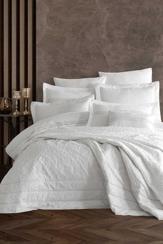 Apricitas Home Rebecca Pamuk Nevresimli Dantelli Yatak Örtüsü Seti, zarif dantel detayları ve %100 pamuk kumaşıyla yatak odanızda hem konforu hem de estetiği bir araya getiriyor. Çelik Kardeşler VIP kalitesiyle sunulan bu özel set, dört mevsim kullanım için ideal yapısıyla dikkat çekerken, modern ve vintage stilin şık uyumunu odanıza taşıyor.