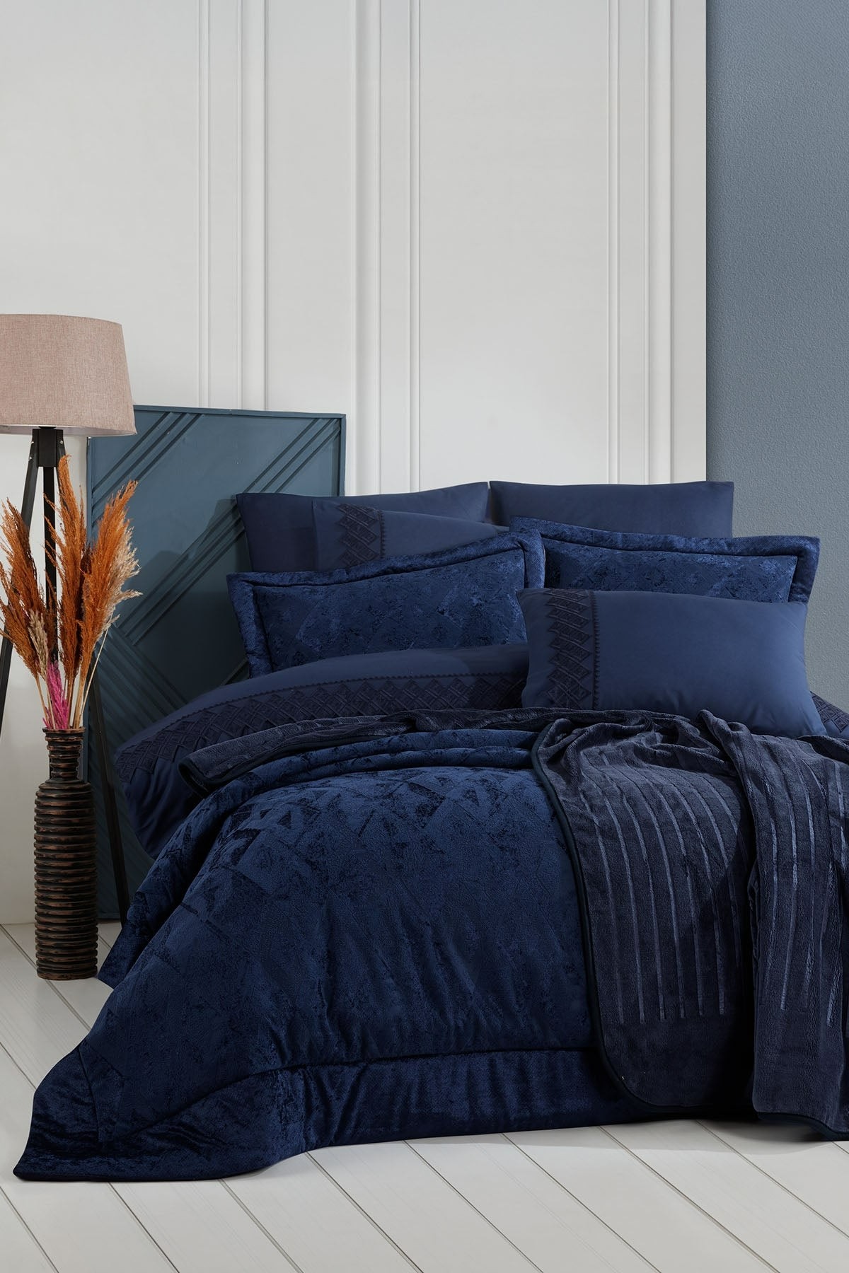 ELART Vanetta 10 Parça Çeyiz Paketi Lacivert, zarafet ve lüksü bir araya getiren tasarımıyla yatak odanıza asil bir dokunuş katıyor. Kadife yatak örtüsünün göz alıcı dokusu, %100 pamuk dantelli nevresim takımı ve embos battaniyenin sıcak tutan yapısıyla bu set; hem estetik hem de işlevselliği bir arada sunuyor. Yeni ev kuranlar, çeyiz alışverişinde olanlar ya da odasını yenilemek isteyenler için mükemmel bir seçim olan bu set, Çelik Kardeşler VIP kalitesiyle sizlerle buluşuyor.