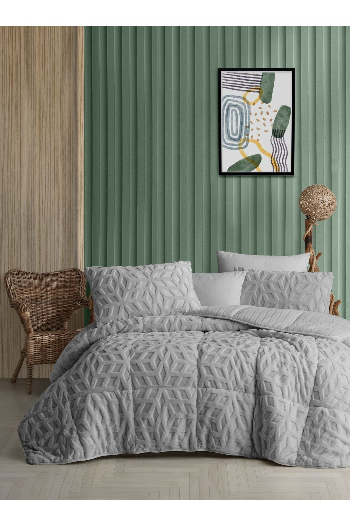 HesabımElart Soft Comfort Set Modern Uyku Seti Çift Kişilik Gri, modern çizgilerle şıklığı buluşturan tasarımıyla yatak odanıza bambaşka bir atmosfer katıyor. Çelik Kardeşler VIP kalitesiyle sunulan bu 3 parçalık set, hem yatak örtüsü hem de yorgan olarak kullanılabilen çok yönlü tasarımıyla dikkat çeker. Şık kapitone dikişler, geometrik desenlerle buluşarak estetik ve fonksiyonelliği bir araya getirir. Yumuşacık dokusu sayesinde huzurlu bir uyku deneyimi sunarken, canlı gri rengiyle modern yaşam alanlarına zarif bir enerji kazandırır.