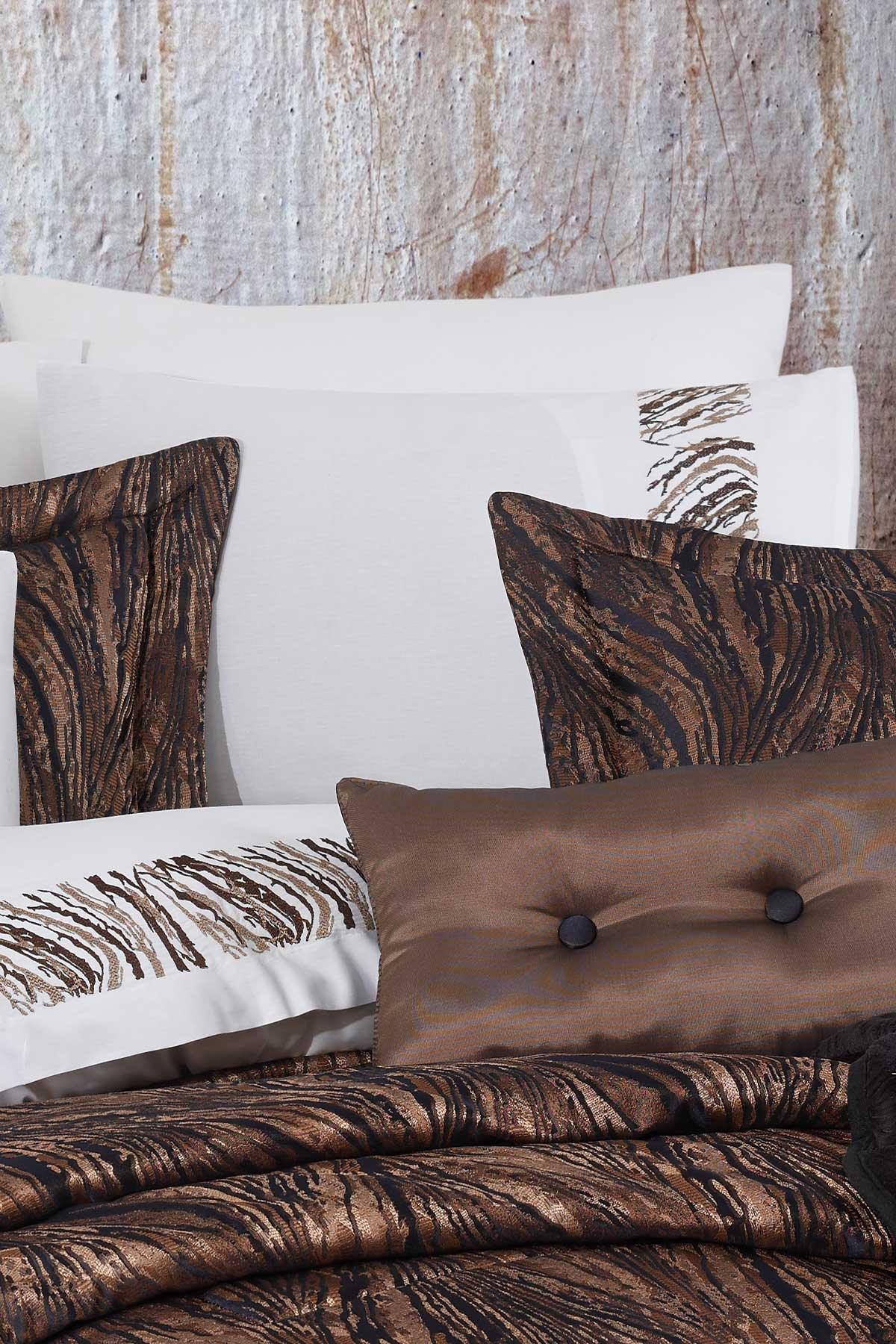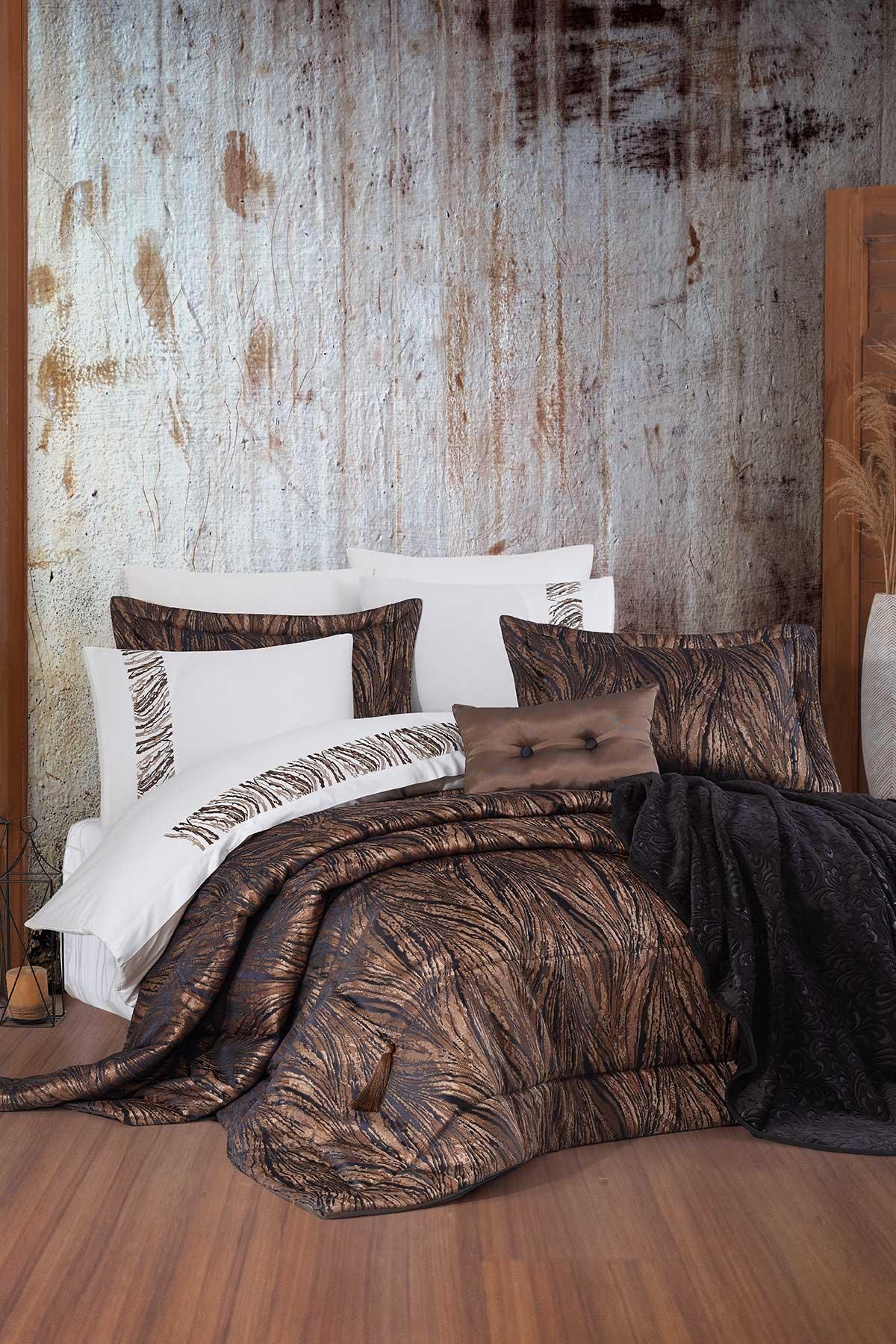 Yatak örtüsü büyük ölçüsü ile yatağınızı şık bir şekilde kaplar. Jakar kumaşın parlak yapısı, renk kombinasyonu ve modern deseniyle ile ister çeyizlik, isterseniz günlük kullanımlarınız için tercih edebilirsiniz. Jakar kumaş parlaklık ve yumuşaklık özelliğini kaybetmez uzun ömürlüdür, kırışmaz ve ütüleme istemez. Size rahat kullanımının yanı sıra şık görünümlü bir kullanım sağlar. Ürünün içi elyaf dolguludur. Nakışlı nevresim takımı yatak örtüsü deseniyle kombindir ve %100 organik pamuktan üretilmiştir. Pamuğun hava geçirgen ve sağlıklı yapısı size kaliteli ve konforlu bir uyku deneyimi sunar. Setin battaniyesi ideal kalınlığı ile sıcak tutma özelliğinin yanı sıra üzerinizde ağırlık hissi yaşatmaz. Çarpıcı renkleri ve klasik ile modern tarzın birlikte yorumlandığı bu sette ihtiyacınız olan tüm ürünleri bulacaksınız.