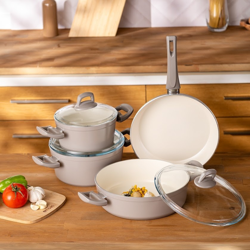 Emsan Swiss Crystal 7 Parça Tencere Seti, zarif bej rengi ve üstün pişirme performansıyla mutfağınıza estetik ve kullanım kolaylığı sunuyor. İndüksiyon hariç tüm ocak tipleriyle uyumlu olan bu set, yemeklerinizi eşit ısı dağılımıyla mükemmel şekilde pişirmenize yardımcı olur.
