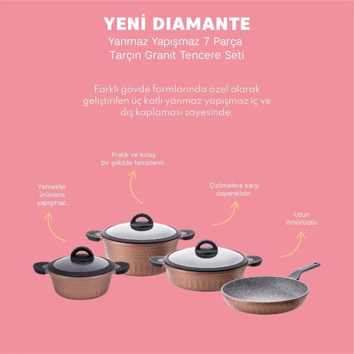 HesabımEmsan Yeni Diamante 7 Parça Granit Tencere Seti Tarçın ile yemeklerinizi daha lezzetli ve sağlıklı pişirin. Çelik Kardeşler VIP avantajları ve elden taksit seçenekleriyle bu şık ve dayanıklı tencere setine sahip olun.