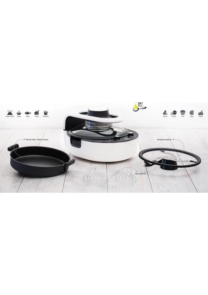 Pişirme Tavası/Kapası: 3 litre kapasitesine sahip ve 28 cm çapında olan özel yapışmaz kaplamalı pişirme tavası ile kullanımı pratik ve kolaydır.
