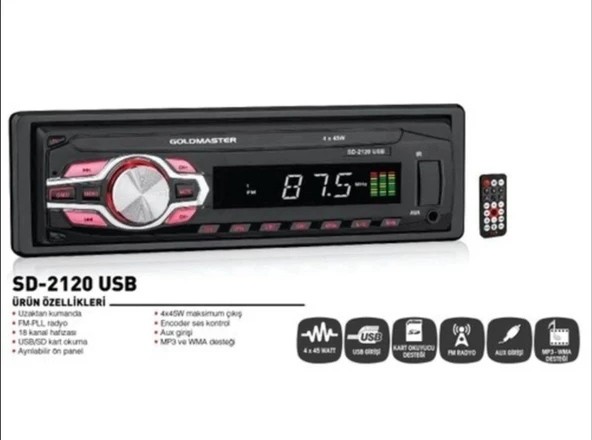HesabımGoldmaster SD-2120 4x45 W Oto Teyp, aracınızda müzik keyfini en yüksek ses kalitesiyle yaşamanızı sağlayan bir oto teyptir. 4x45W maksimum çıkış gücü ile güçlü ses performansı sunar. FM-PLL radyo özelliği ve 18 kanal hafızası sayesinde kesintisiz radyo dinleme imkanı tanırken, USB ve SD kart okuma desteği ile müzik koleksiyonunuzu kolayca dinleyebilirsiniz. Ayrılabilir ön panel ve uzaktan kumanda gibi pratik özellikler ise kullanım kolaylığı sağlar.