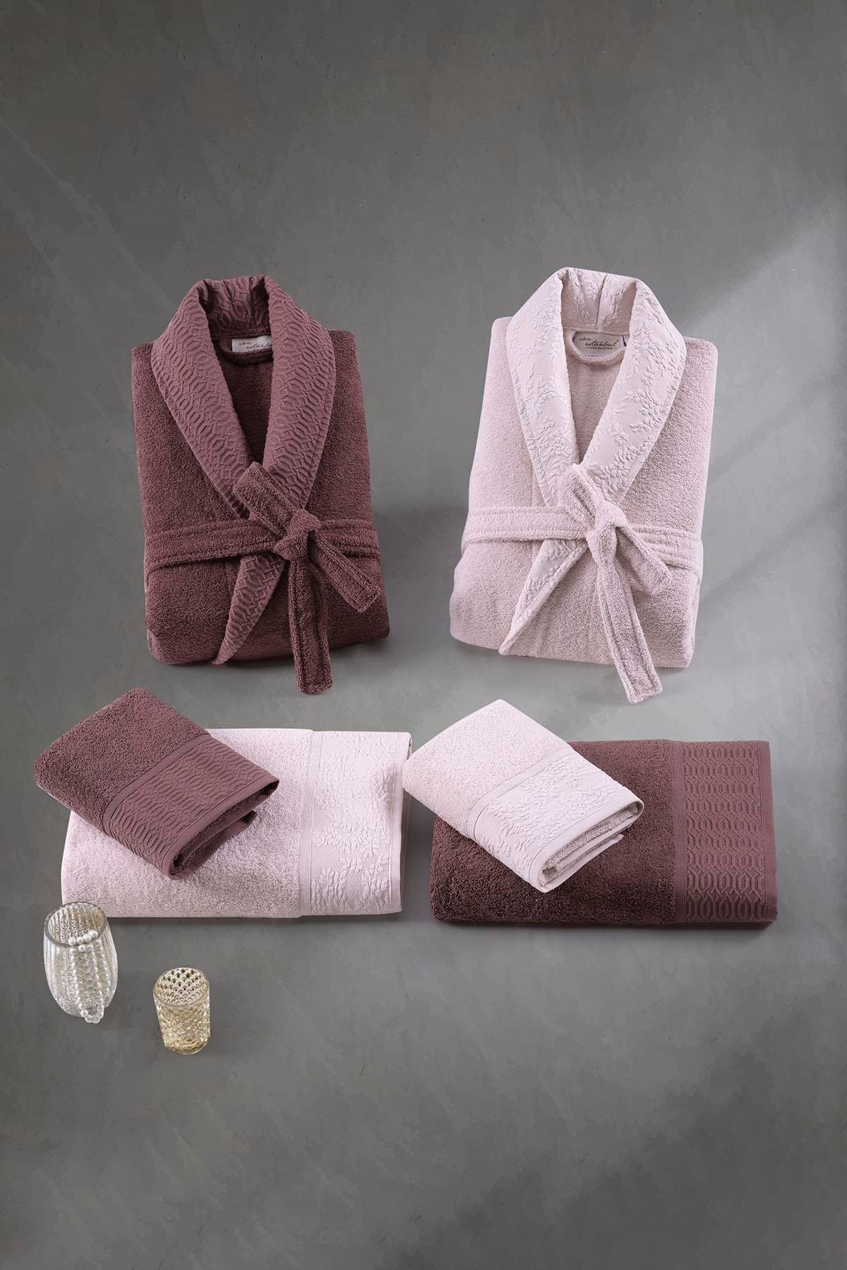İstanbulEssence Aile Bornoz Seti Pudra - Mürdüm, banyonuzda estetik ve konforu bir araya getirir. %100 pamuk kumaşıyla, hem şık hem de fonksiyonel bir kullanım sunar.