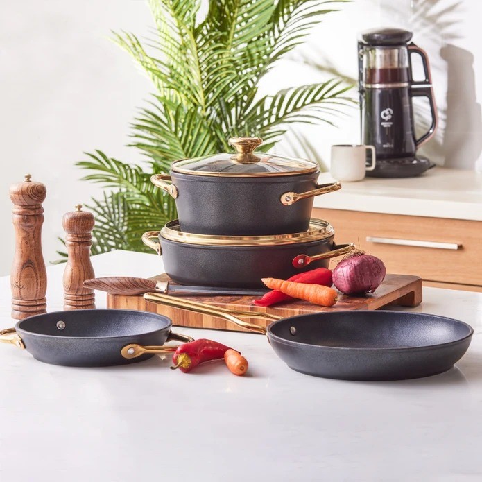 HesabımKaraca BioDiamond Power 6 Parça Tencere Seti Gold, dayanıklı granit kaplaması ve şık altın rengi ile mutfakta hem performans hem de estetik sunar. Farklı boyutlarıyla her türlü yemek için idealdir. Çelik Kardeşler VIP garantisi ve elden taksit avantajıyla hemen sahip olun!