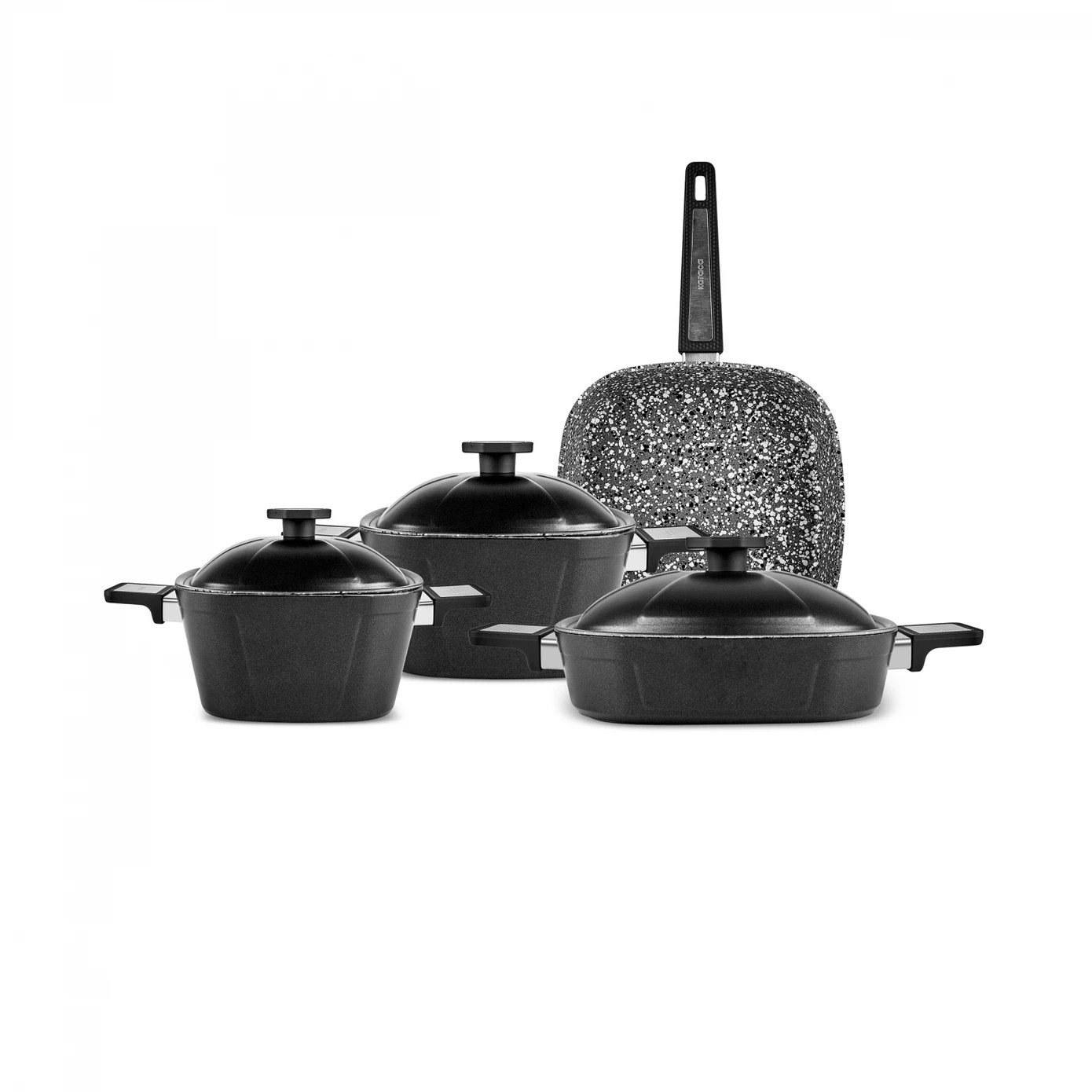 Karaca Biogranit Tank 7 Parça Tencere Seti, granit kaplama sayesinde yüksek ısıya dayanıklı, sağlıklı pişirme sağlar. İndüksiyon dahil tüm ocak tiplerinde kullanılabilir ve mükemmel sonuçlar elde etmenize yardımcı olur. Şık siyah tasarımı, mutfaklarınızda modern bir hava yaratır.