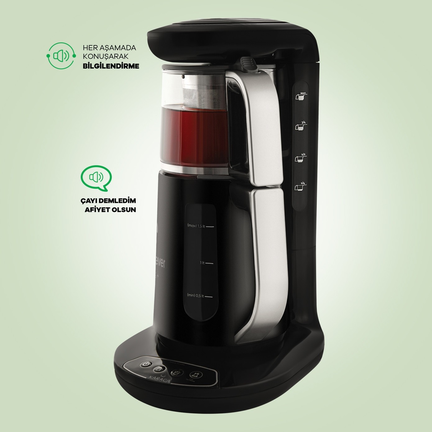 Karaca Çaysever Robotea, cam demlikli çay makinesi, sesli uyarılı çaycı, damıtma tekniği çay makinesi, ısı kontrollü çay makinesi