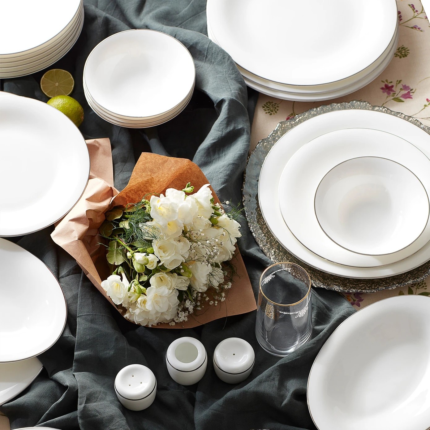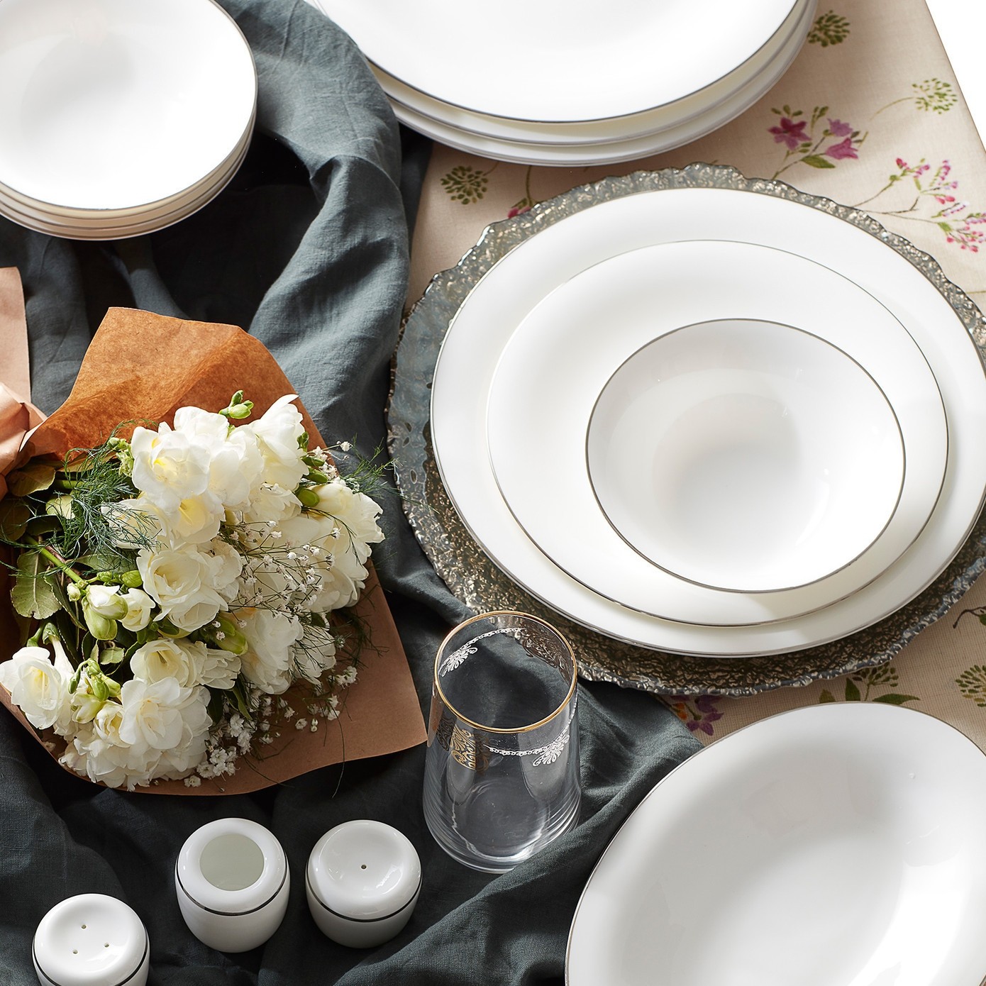 Karaca Fine Pearl Fame 58 Parça 12 Kişilik Yemek Takımı, sofistike platin rengiyle sofralarınıza zarafet katacak. Fine Pearl serisinin bu özel koleksiyonu, estetik ve kaliteyi bir arada sunarak her davetinizde göz alıcı bir görünüm oluşturur. Modern tasarımı ve şıklığıyla hem günlük kullanımda hem de özel günlerde mükemmel bir tercihtir.