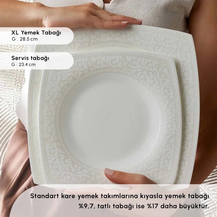 Karaca Square Bone Salen 57 Parça Yemek Takımı, modern tasarımı ve şıklığı ile sofralarınıza zarif bir dokunuş katıyor. Emboss desenli ve kare formuyla dikkat çeken bu yemek takımı, 12 kişilik set içeriğiyle aileniz ve misafirlerinizle unutulmaz yemek deneyimleri sunar. Beyaz renginin zarifliği, her türlü sofraya uyum sağlar. Mikrodalgada kullanılabilir ve bulaşık makinesine uygun olması sayesinde pratik bir kullanım sunar. Karaca’nın kalitesi ve Sarıçelik VIP güvencesiyle, elden taksit imkanıyla hemen sahip olabilirsiniz.