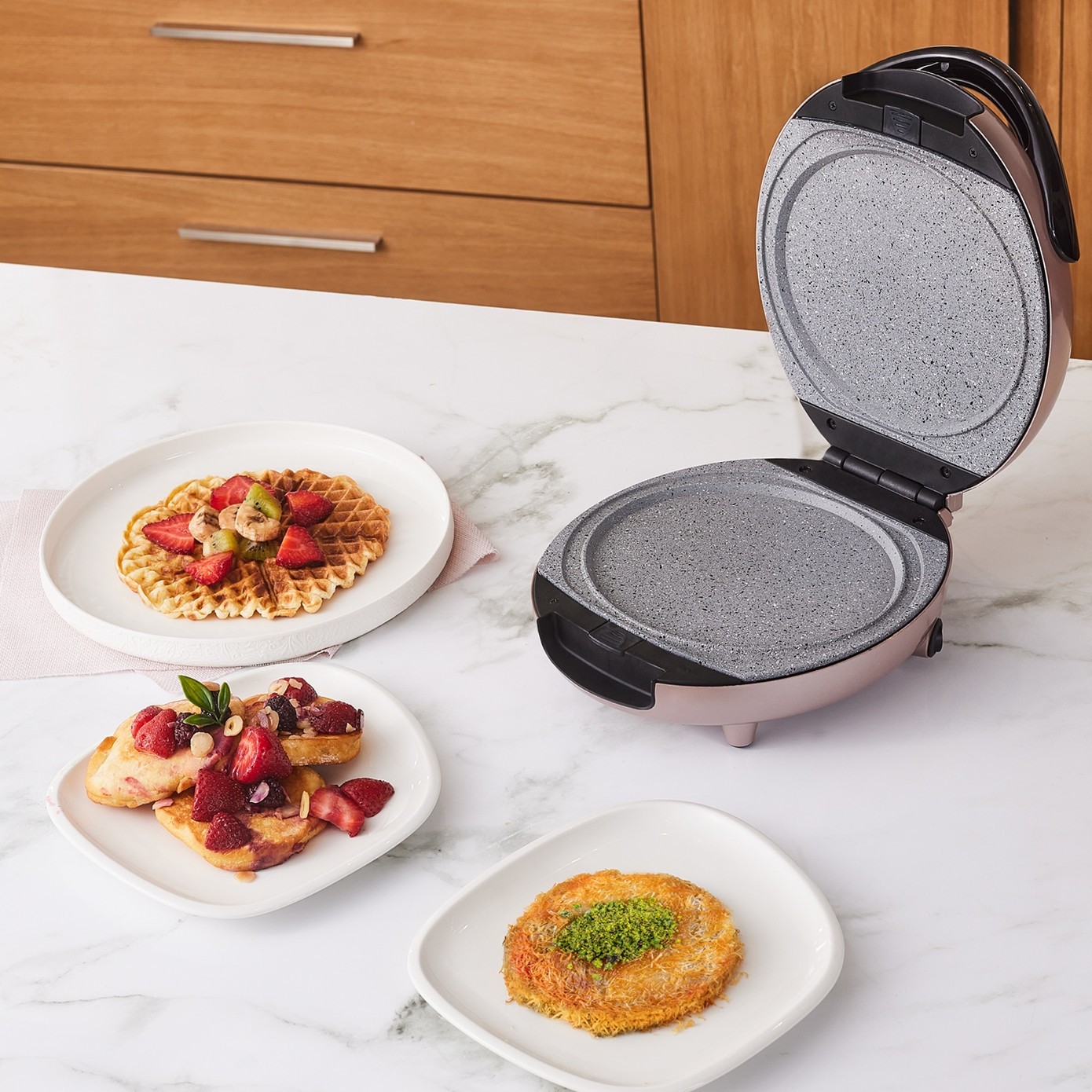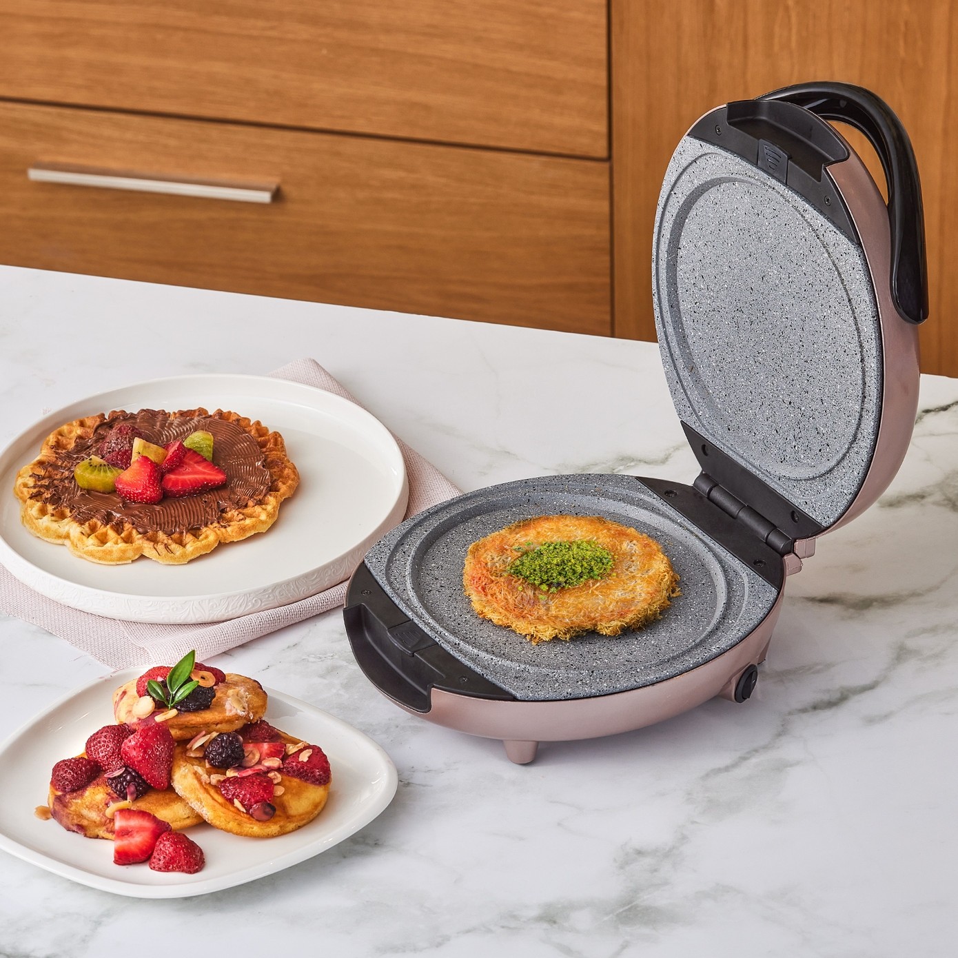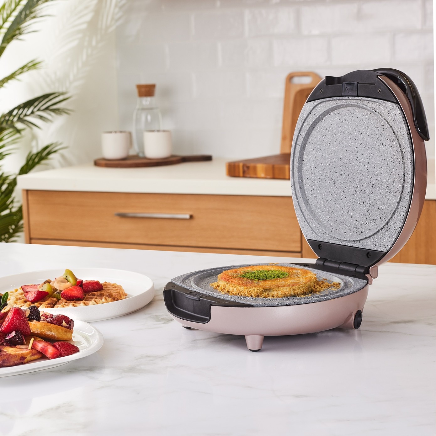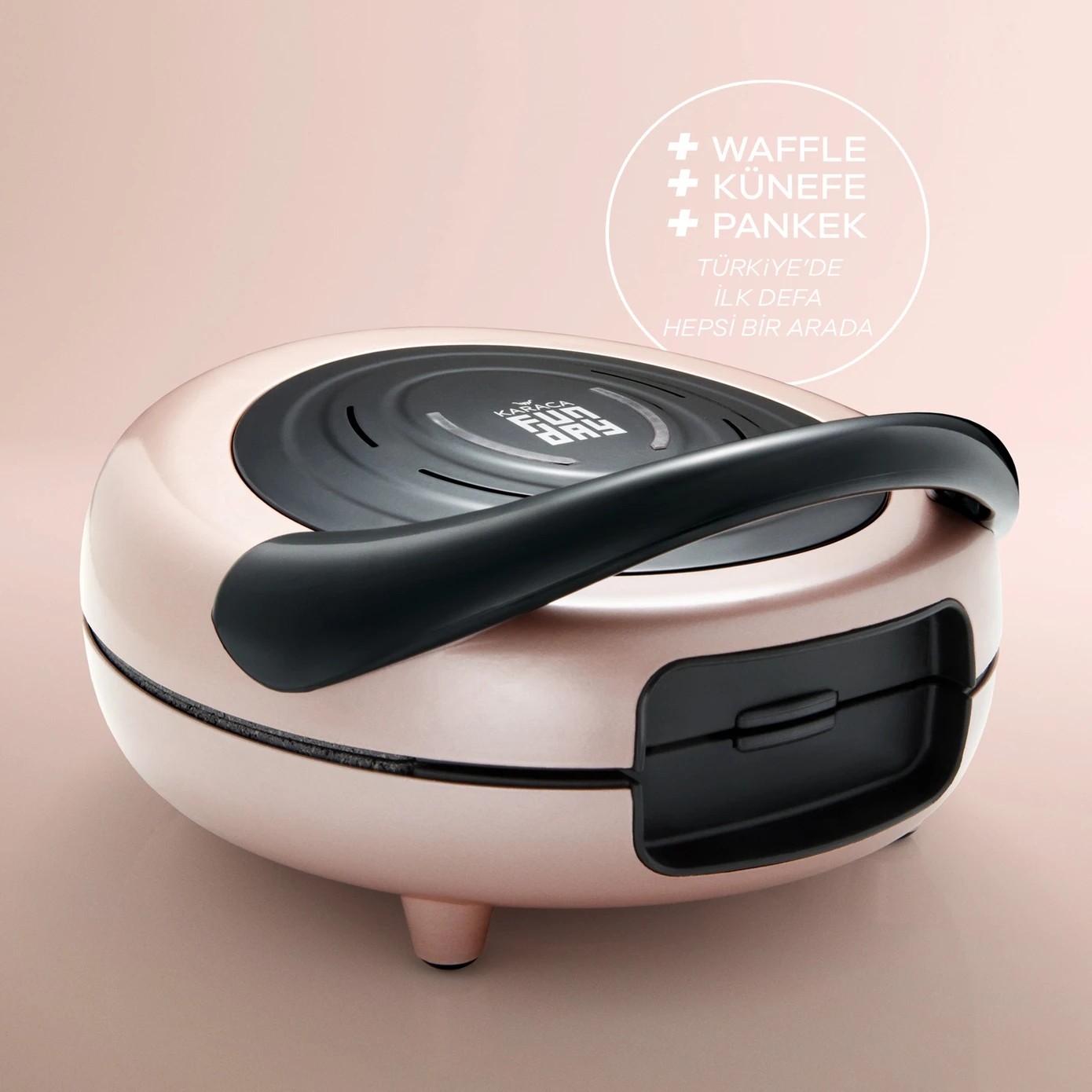 Türkiye’de bir ilk! Karaca Funday Rosegold Waffle Makinesi, 4 dakikada waffle pişirme hızı ve eşit ısı dağılımı sağlayan granit görünümlü kaplama plakalarıyla mükemmel sonuçlar sunar. Çıkarılabilir ve bulaşık makinesinde yıkanabilir plakaları sayesinde temizlik zahmetsizdir. Değiştirilebilir plakalarıyla waffle, pankek ve künefe yapma imkanı sunarak mutfağınıza pratiklik ve çeşitlilik katar. Çelik Kardeşler VIP farkıyla elden taksit ve uygun fiyat fırsatlarını kaçırmayın!