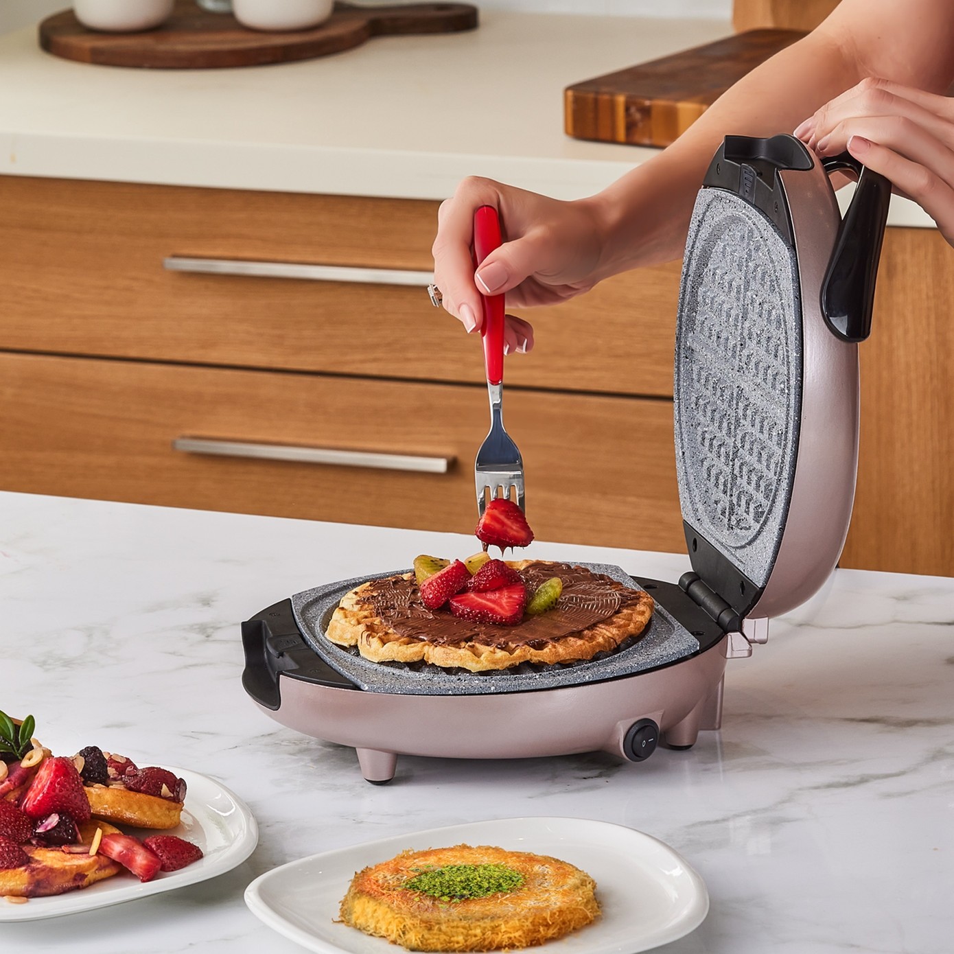 HesabımTürkiye’de bir ilk! Karaca Funday Rosegold Waffle Makinesi, 4 dakikada waffle pişirme hızı ve eşit ısı dağılımı sağlayan granit görünümlü kaplama plakalarıyla mükemmel sonuçlar sunar. Çıkarılabilir ve bulaşık makinesinde yıkanabilir plakaları sayesinde temizlik zahmetsizdir. Değiştirilebilir plakalarıyla waffle, pankek ve künefe yapma imkanı sunarak mutfağınıza pratiklik ve çeşitlilik katar. Çelik Kardeşler VIP farkıyla elden taksit ve uygun fiyat fırsatlarını kaçırmayın!