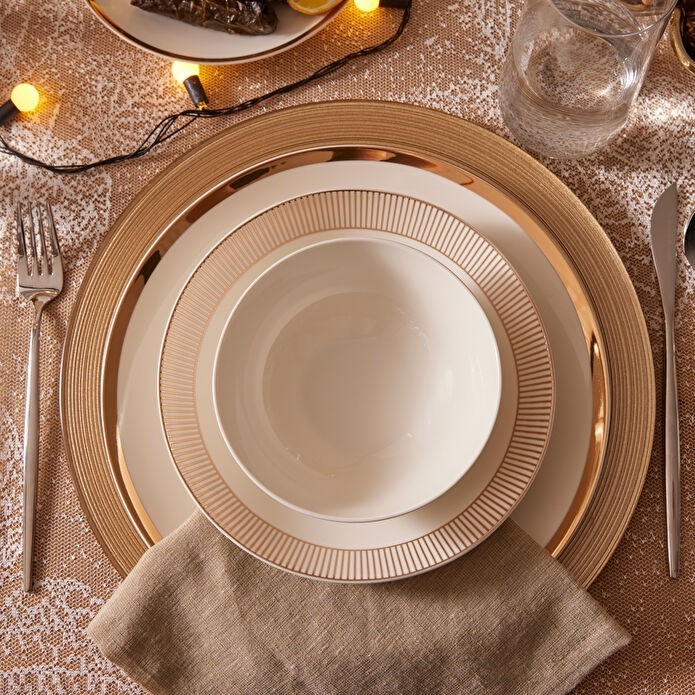 Beyaz zemin ve altın renkli ince çizgiler ile tasarlanmış olan takım, modern ama aynı zamanda zarif bir görünüme sahiptir. Sofranızda minimalist bir şıklık yaratır.