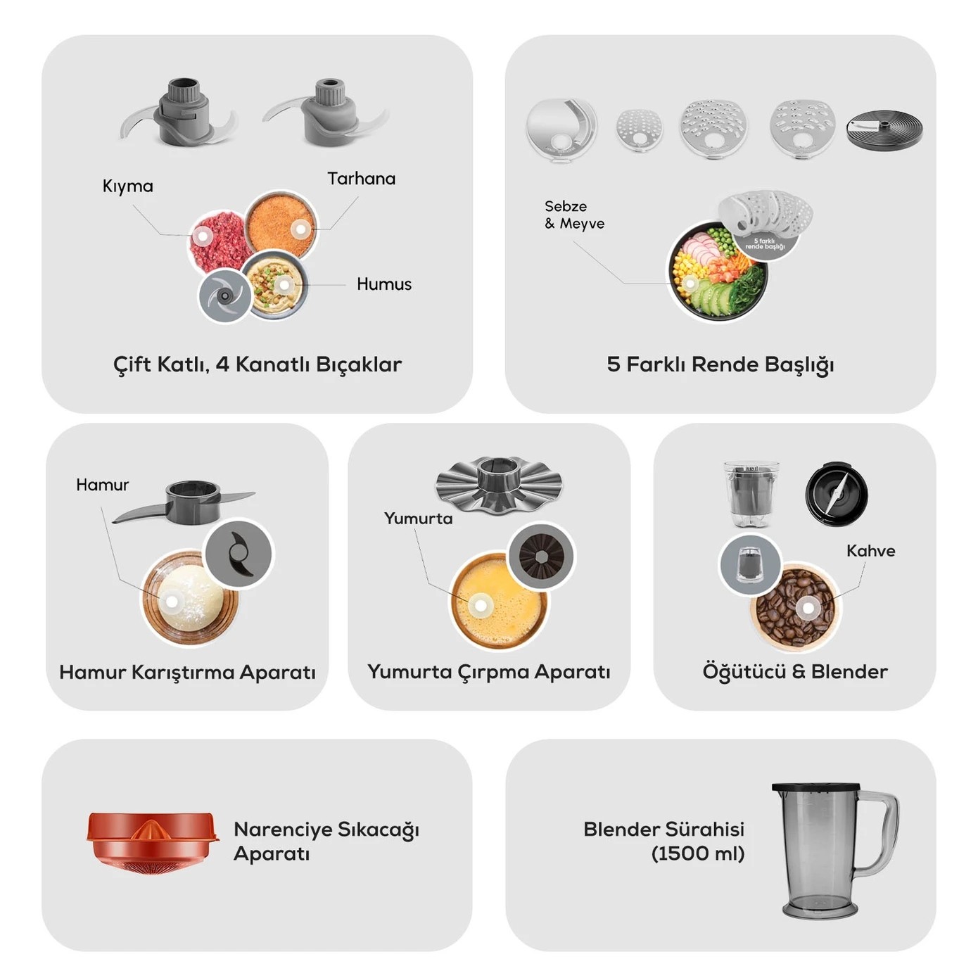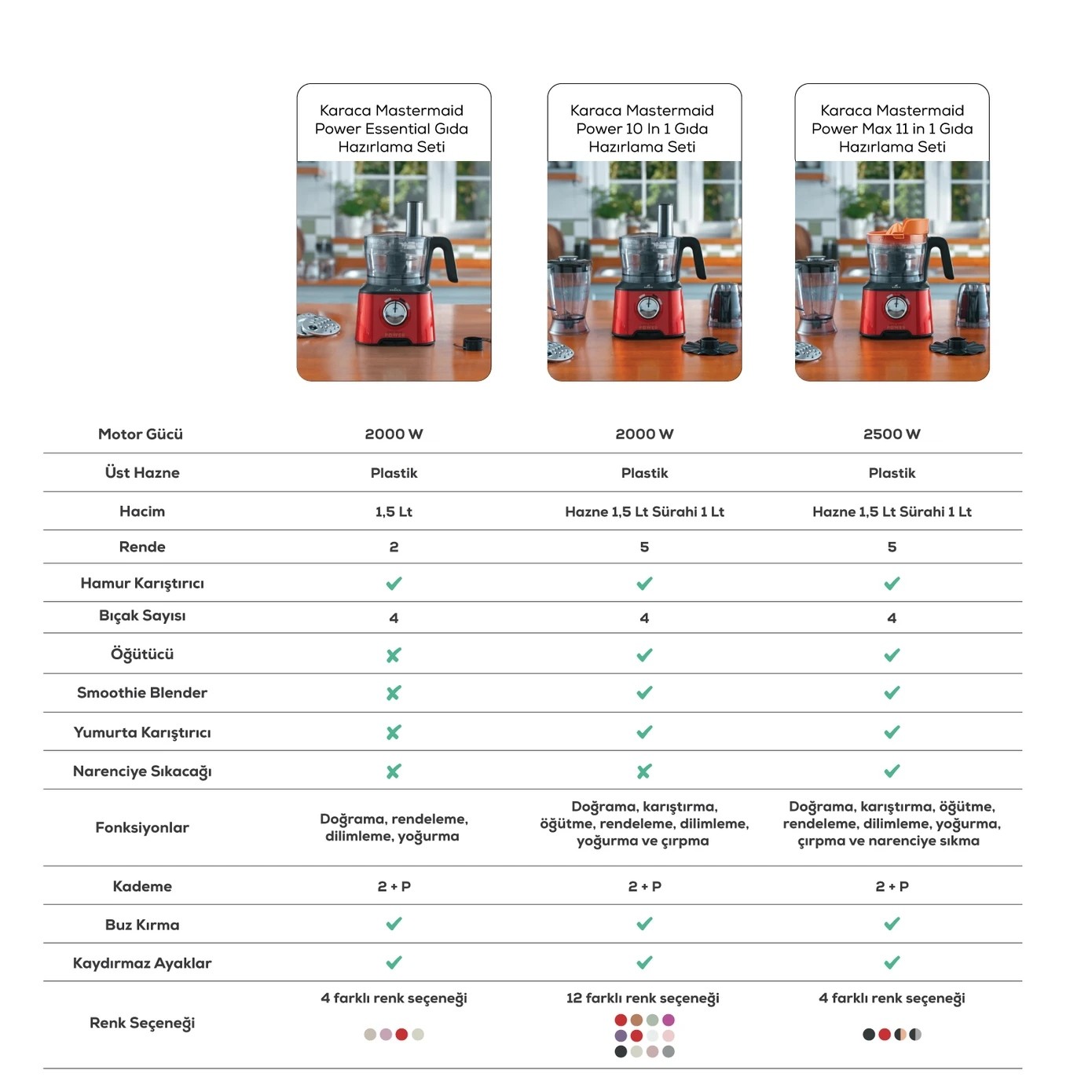 HesabımKaraca Mastermaid Power Max 11 in 1 Mutfak Robotu, 2500W motor gücü ve Black Copper tasarımıyla mutfağınıza güç ve şıklık katıyor. 11 farklı fonksiyonu bir araya getiren bu çok yönlü ürün, doğrama, karıştırma, yoğurma, çırpma ve hatta buz kırma gibi tüm işlemleri tek cihazda toplar. Renkli aparat eşleştirme özelliği sayesinde her aparata uygun hız ayarını kolayca yapabilirsiniz. Geniş haznesi, çift katlı bıçakları ve zengin aparat içeriğiyle Karaca kalitesini Çelik Kardeşler VIP farkıyla yaşayın.