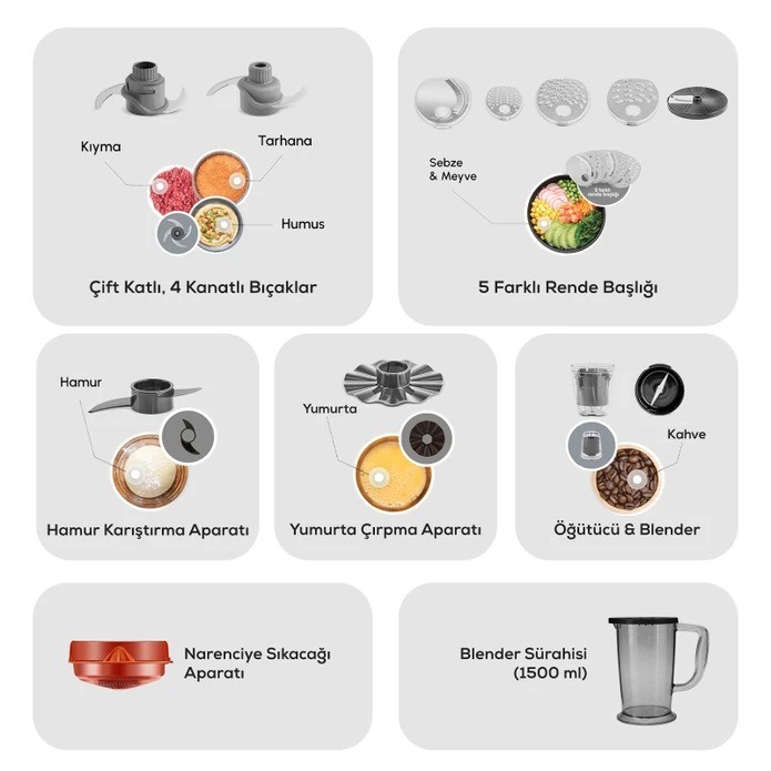 Doğrama, karıştırma, öğütme, rendeleme, dilimleme, yoğurma, çırpma ve narenciye sıkma gibi birçok işlemi tek bir cihazla gerçekleştirebilirsiniz. Her mutfak işini kolayca halletmek için ideal.
