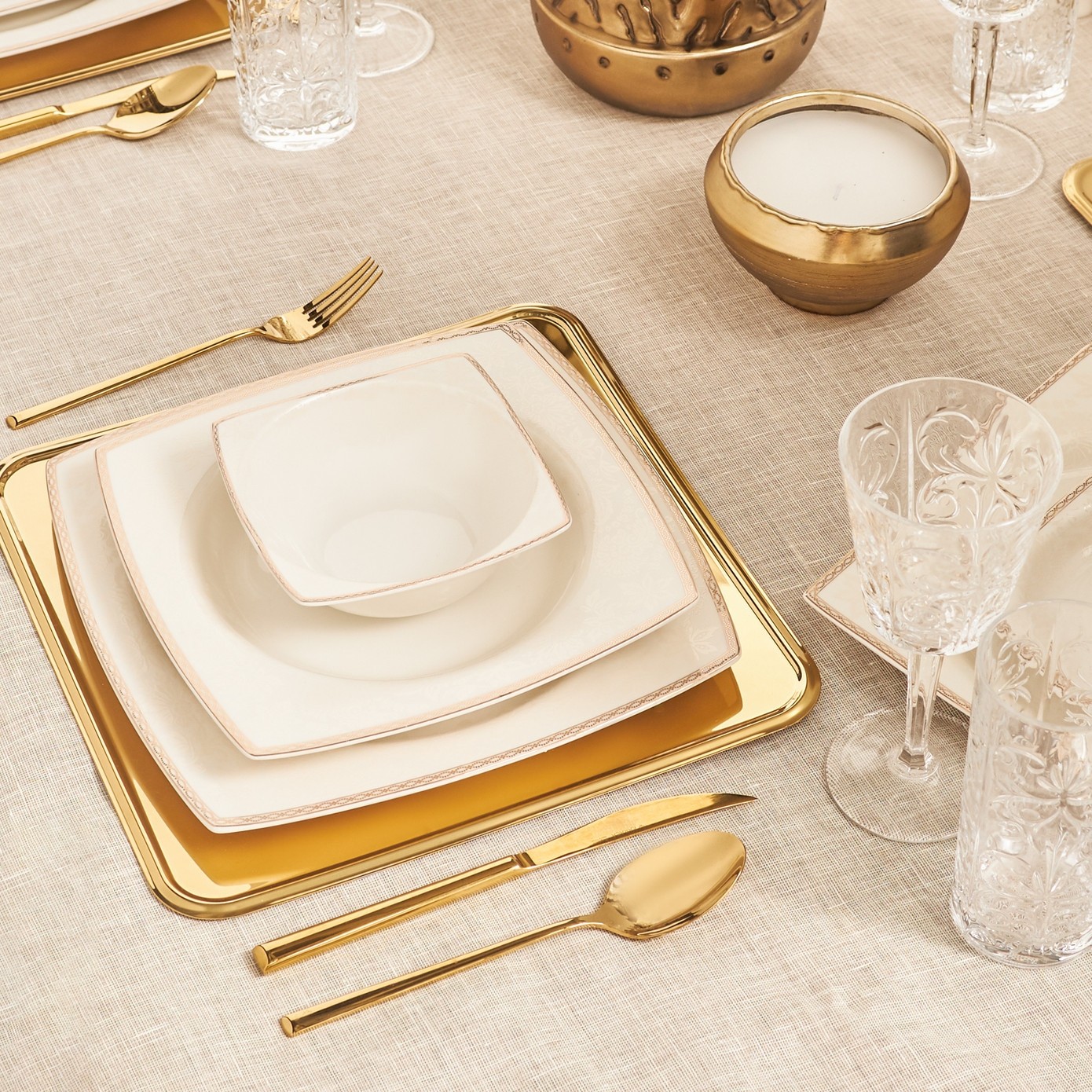Karaca Square Bone Fancy 53 Parça 12 Kişilik Yemek Takımı, modern kare formu ve zarif emboss (kabartma) deseniyle sofralarınıza şıklık katıyor. Bone malzemeden üretilmiş bu set, estetik ve dayanıklılığı bir arada sunuyor. 12 kişilik set içeriğiyle geniş aile yemekleri veya davetler için ideal bir seçim. "Elden taksit imkanı" ve "Sarıçelik VIP" fırsatlarıyla uygun fiyatla sahip olabilirsiniz.
