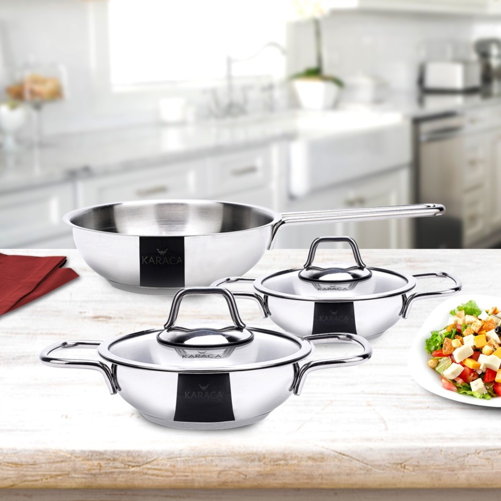 Karaca Sahan Seti Macellan, mükemmel ısı dağılımı sağlayarak yemeklerinizi daha hızlı pişirir ve daha verimli bir şekilde enerji tasarrufu yapmanızı sağlar. Şık tasarımı sayesinde sofralarınızı daha zarif hale getiren bu sahan seti, yemeklerinizi pişirirken ve servis ederken size pratiklik sunar. Yapışmaz özellikli kaplama, temizliği kolaylaştırırken yemeklerinizin sağlıklı bir şekilde pişmesini sağlar. Ayrıca ergonomik kulpları, güvenli taşıma ve kullanım kolaylığı sağlar.