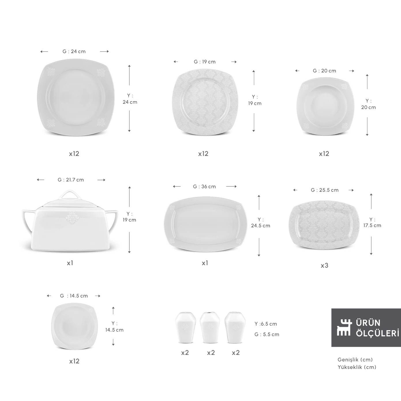 Karaca Goldies 57 Parça 12 Kişilik Porselen Yemek Takımı ile sofralarınıza zarif bir dokunuş katın! Goldies, şıklığını zarif gold çizgilerinden alırken, klasik desenlerin modern yorumuyla tasarlandığı bu takım, zamansız bir şıklığa sahiptir. Kalabalık davet sofralarına kusursuz bir görünüm kazandırırken, sahip olduğu ışıltı ile sofradaki aksesuar ihtiyacını karşılar. 12 kişilik servis tabağı, pasta tabağı, çukur tabak ve çorba kasesi yanı sıra küçük ve büyük kayık tabaklar, baharat seti ve kürdanlık da dahil olmak üzere bu setle özel günlerinizde göz alıcı sunumlar yapabilirsiniz.