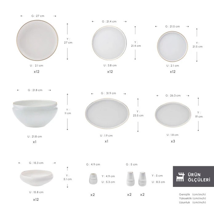 Gold Detaylar: Takımın zarif altın detayları, sofralarınıza lüks bir hava katarken, şıklığıyla göz doldurur.