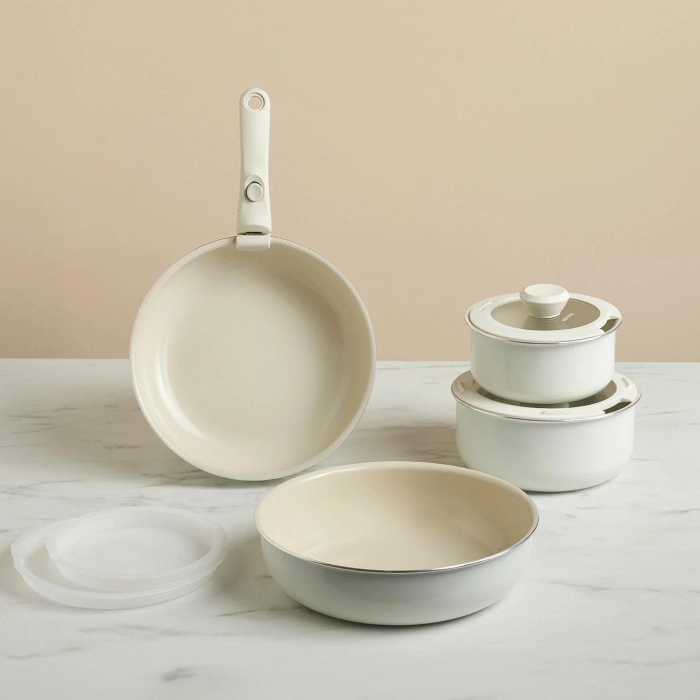 Çok yönlü yapısı ile hem pişirme hem de saklama ihtiyaçlarınıza cevap veren Karaca Swiss Crystal Easy Clip 9 Parça Tencere Seti, mutfağınızda fark yaratır. Şık Almond Cream rengi ile modern bir görünüm sunar.