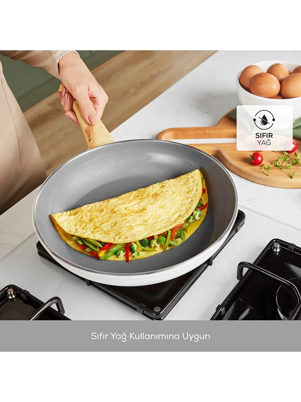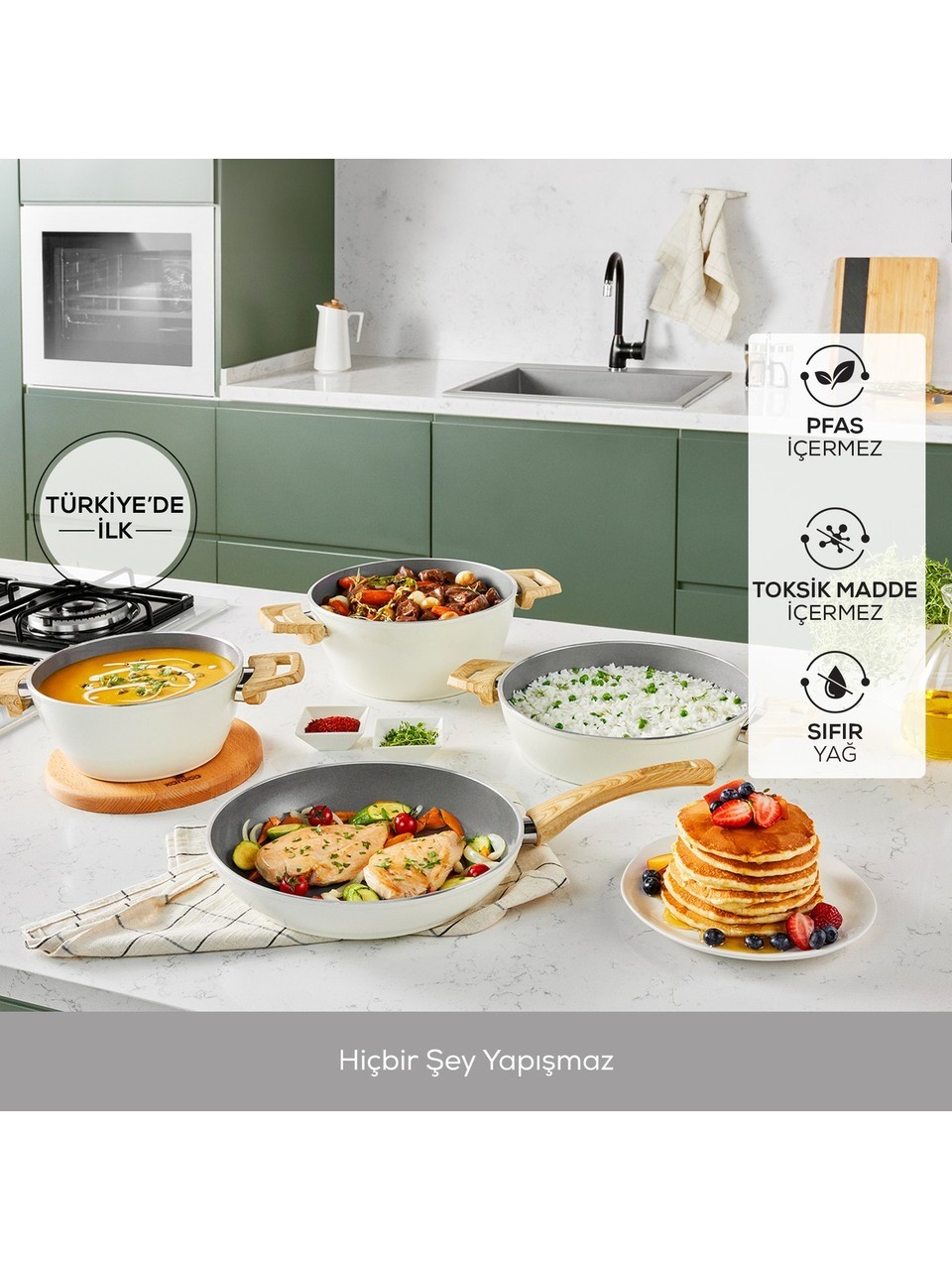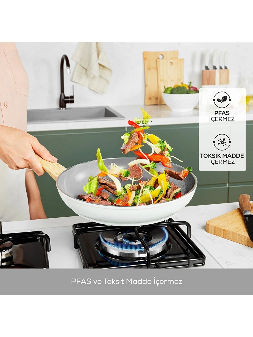 PFAS ve Zararlı Kimyasallar İçermez: Swiss kristallerden oluşan yapışmaz yüzeyi, insan sağlığını tehlikeye sokan "PFAS" gibi zararlı kimyasal maddeler içermez.