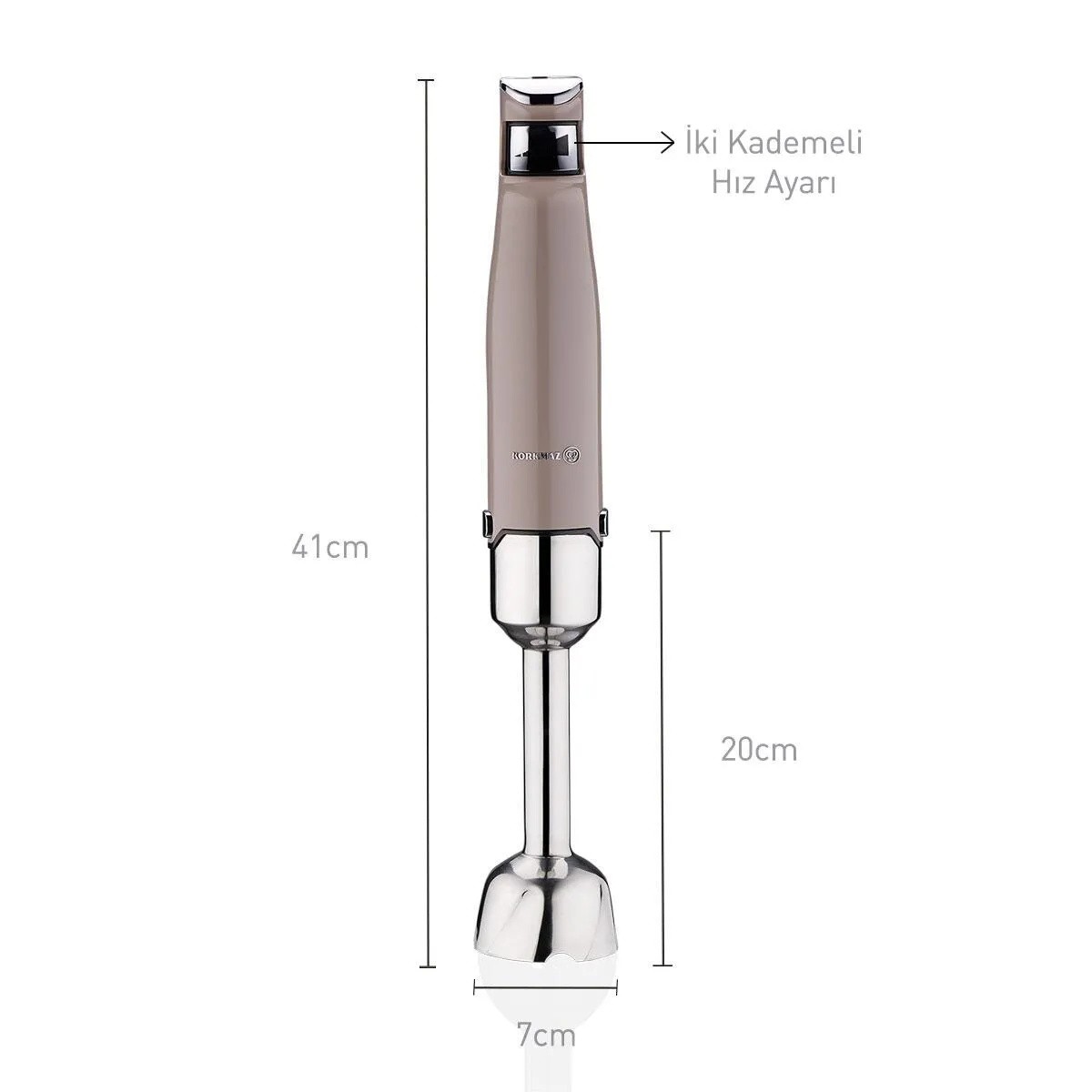 Korkmaz Performix Bej Blender, yüksek performansıyla mutfakta en büyük yardımcınız olacak! 1000 Watt gücü ve ısıya dayanıklı paslanmaz çelik öğütücü çubuğu sayesinde, her türlü malzemeyi kolayca öğütüp karıştırabilirsiniz.