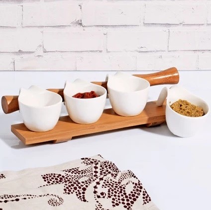 Kosova 4'lü Bambu Standlı Porselen Sos Seti, sofralarınızda şıklığı ve fonksiyonelliği bir arada sunar. Elden taksit seçeneği ile bu şık ve kullanışlı seti kolayca edinebilirsiniz.