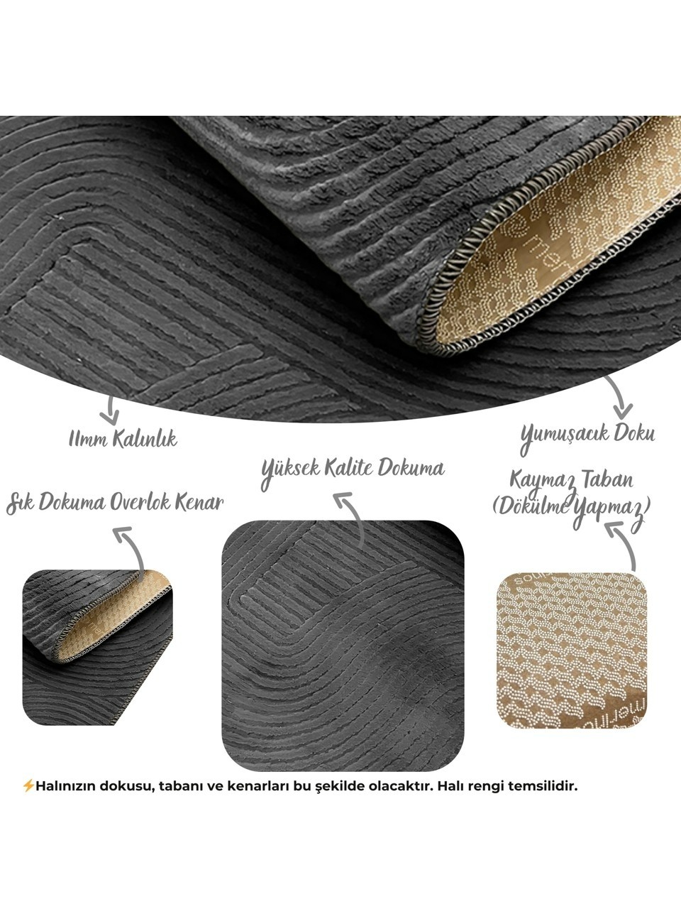 Merinos Rölyef Aden Gri Modern Kaymaz Halı ile evinizin her köşesine şıklık, konfor ve fonksiyonellik kazandırın. Çelik Kardeşler VIP ayrıcalığıyla sunulan bu kaymaz halı modeli, zarif dokusu ve modern desenleriyle göz kamaştırırken; dayanıklı yapısı ve rahat kullanımıyla da fark yaratıyor. Antialerjik ve antibakteriyel özellikleriyle sağlıklı bir yaşam alanı sunan bu halı, kolay temizlenebilir yapısı sayesinde uzun ömürlü kullanım imkânı sağlar. Ev dekorasyonunuza uyum sağlayacak gri tonları ve yumuşak yüzeyiyle her mevsim keyifle kullanabilirsiniz.