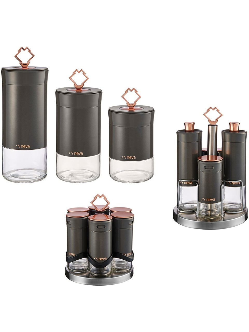 HesabımNeva N3033 Mutfak Kombinim - Grizay, Çelik Kardeşler VIP farkıyla mutfağınıza hem estetik hem de işlevsellik kazandırıyor. Gri ve bakır tonlarının modern uyumunu taşıyan bu özel set, cam ve metalin şıklığını bir araya getiriyor. 3 boy kavanoz, 6'lı döner standlı baharatlık ve 4'lü döner standlı yağlık & sirkelikten oluşan bu kombin, mutfağınızın düzenini sağlarken, sofralarınıza da şıklık katıyor. Her parça, pratik kullanım ve kolay temizlik için tasarlanmıştır.