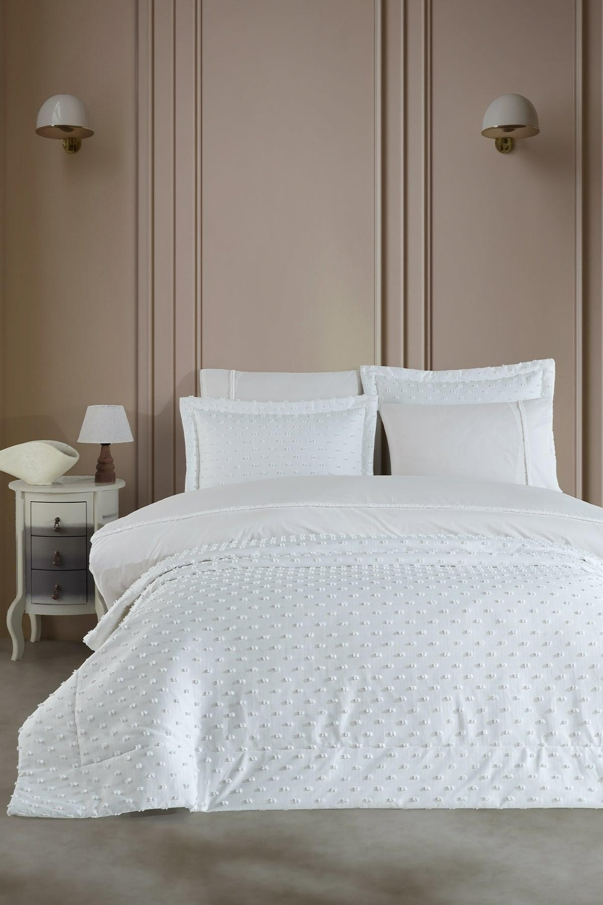 Nora Çeyiz Paketi 7 Parça, yatak odanıza zarif ve şık bir dokunuş katmak için özel olarak tasarlanmıştır. Yüksek kaliteli jakar kesme dokuma kumaşı, estetik desenleri ve dayanıklı yapısı sayesinde uzun ömürlü kullanım sunar. Pamuklu nevresim takımı, nefes alabilen yapısı ve yumuşak dokusu ile konforlu bir uyku deneyimi sağlar. Kullanım kolaylığı sunan fermuarlı nevresimi ve el işçiliğiyle oluşturulmuş zarif desenleriyle çeyizinizin en özel parçalarından biri olacak.
