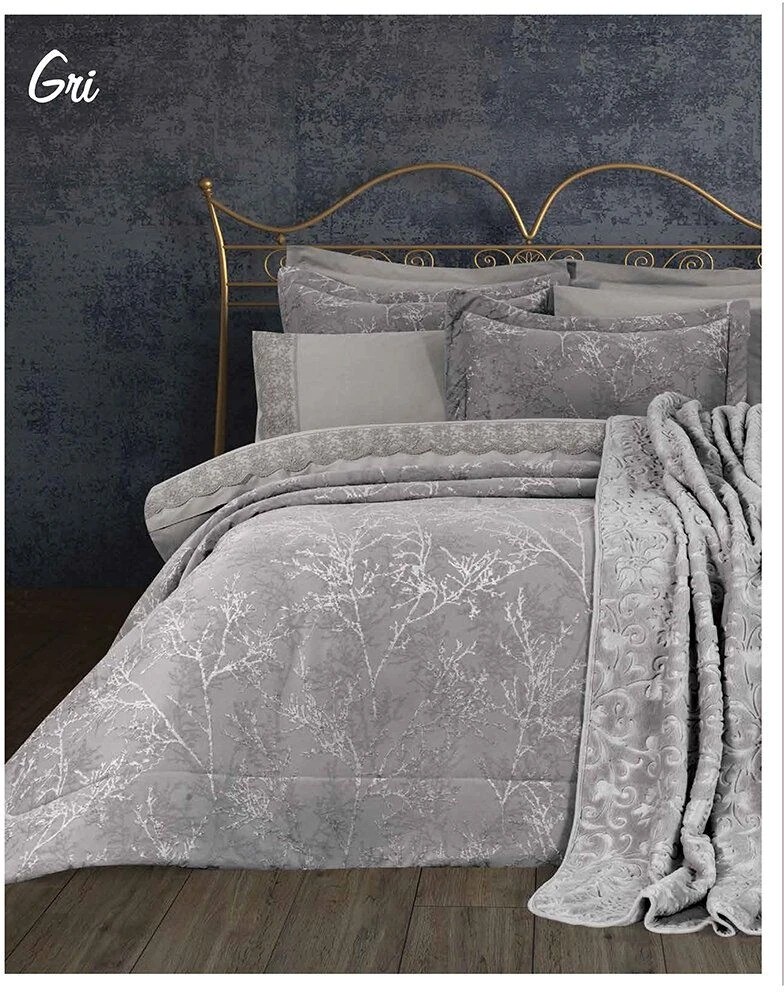 HesabımÖzdilek Branch Gümüş 16 Parça Çeyiz Seti, evinizi zarafet ve konforla buluşturuyor. Şık gümüş rengi tasarımıyla, yatak odanıza modern bir dokunuş katacak. Çift kişilik yataklar için tasarlanmış bu set, %100 pamuk nevresim takımı, %100 polyester yatak örtüsü ve embos battaniye gibi kaliteli malzemelerle üretilmiştir. Her bir parçası, uzun ömürlü ve rahat kullanım sağlar.