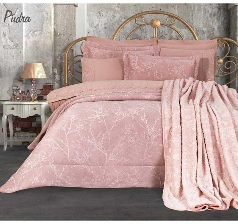 HesabımÖzdilek Branch Pudra 16 Parça Çeyiz Seti, evinizi şıklık ve konforla tamamlamak için ideal bir seçimdir. Çift kişilik yataklar için tasarlanmış bu set, %100 pamuk nevresim takımı, %100 polyester yatak örtüsü ve embos battaniye gibi kaliteli malzemelerle üretilmiştir. Üstün kaliteyi ve zarif tasarımı bir araya getiren bu set, yatak odanıza zarif bir dokunuş katacak.