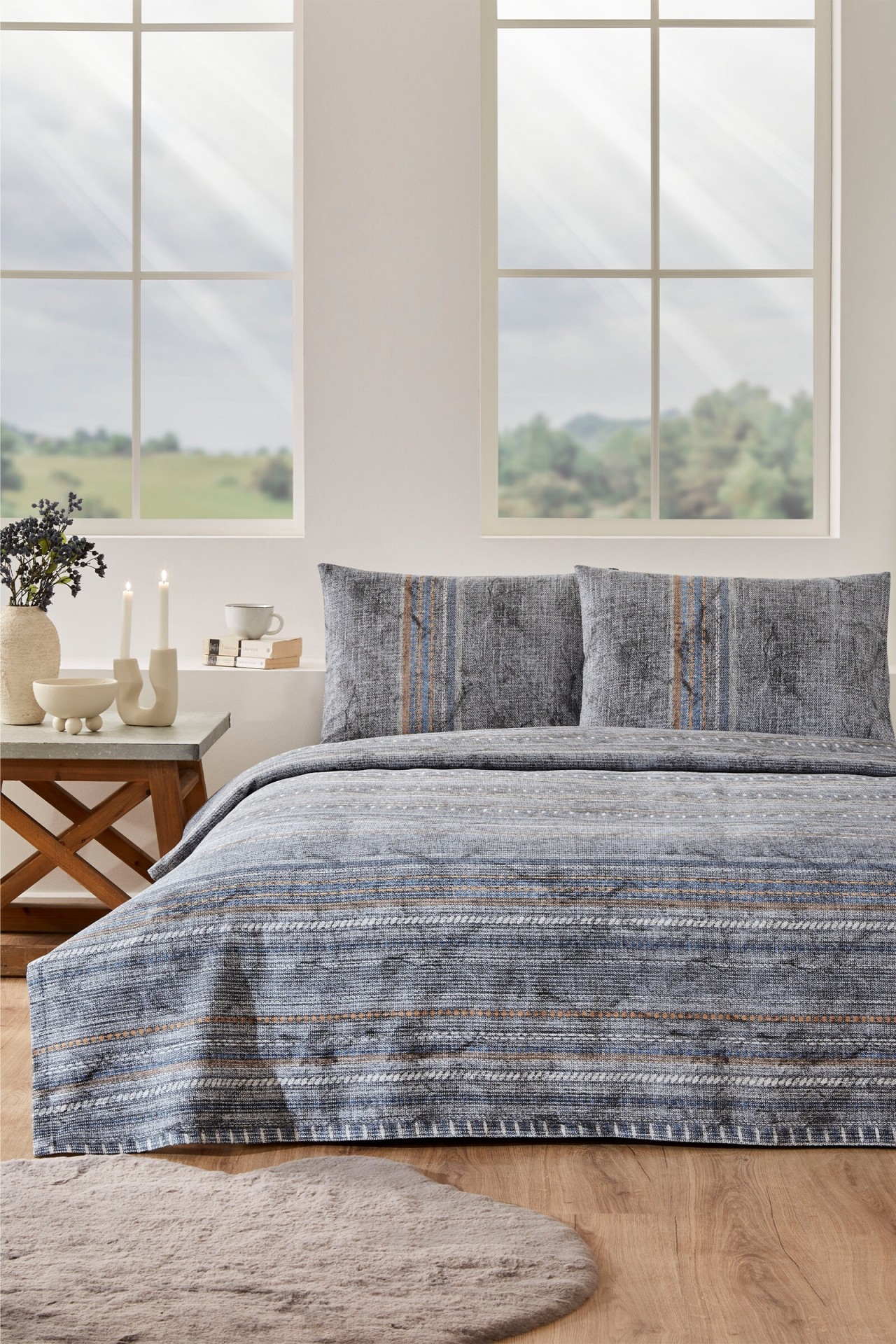 Özdilek Perla Yatak Örtülü Çift Kişilik Nevresim Takımı – Gri, zarif tasarımı ve konforlu yapısıyla yatak odanıza şıklık ve fonksiyonellik katar. Pamuk ve polyester karışımı kumaşıyla yumuşak dokusu ve dayanıklılığı bir arada sunar.
