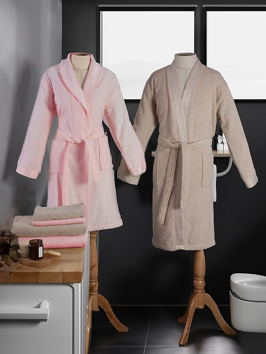 Özdilek Elissa Taş Pudra Aile Bornoz Takımı, zarif tasarımı ve doğal pamuk dokusuyla banyo keyfini bambaşka bir seviyeye taşır.