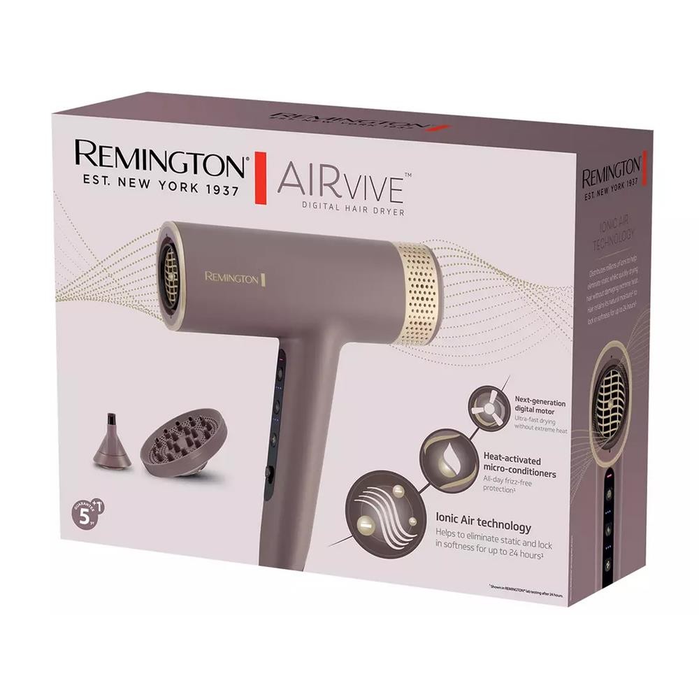 Remington AirVive saç kurutma makinesi, milyonlarca iyon üreten yüksek hızlı hava akışı sayesinde saçtaki statik elektriğin azaltılmasına yardımcı olur.