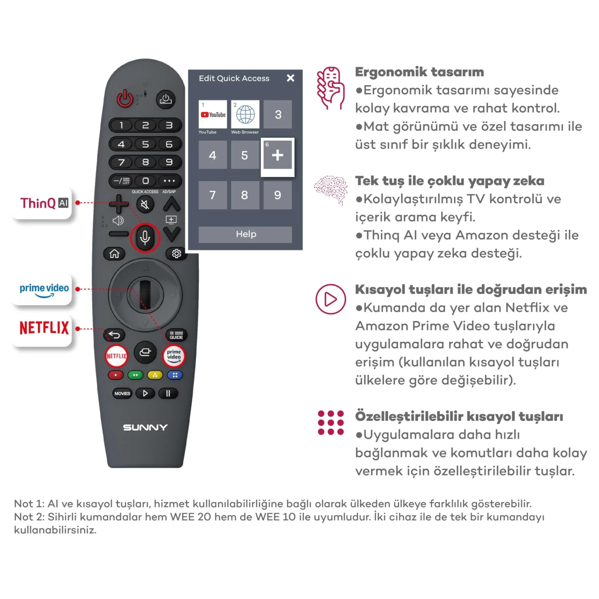 Eğer 65 inç QLED TV, 4K Ultra HD Smart TV, webOS televizyon, Apple AirPlay destekli TV veya fiyat/performans QLED TV arıyorsanız, Sunny SN65QMN252 güçlü teknik özellikleri ve ödeme avantajlarıyla doğru bir tercihtir.