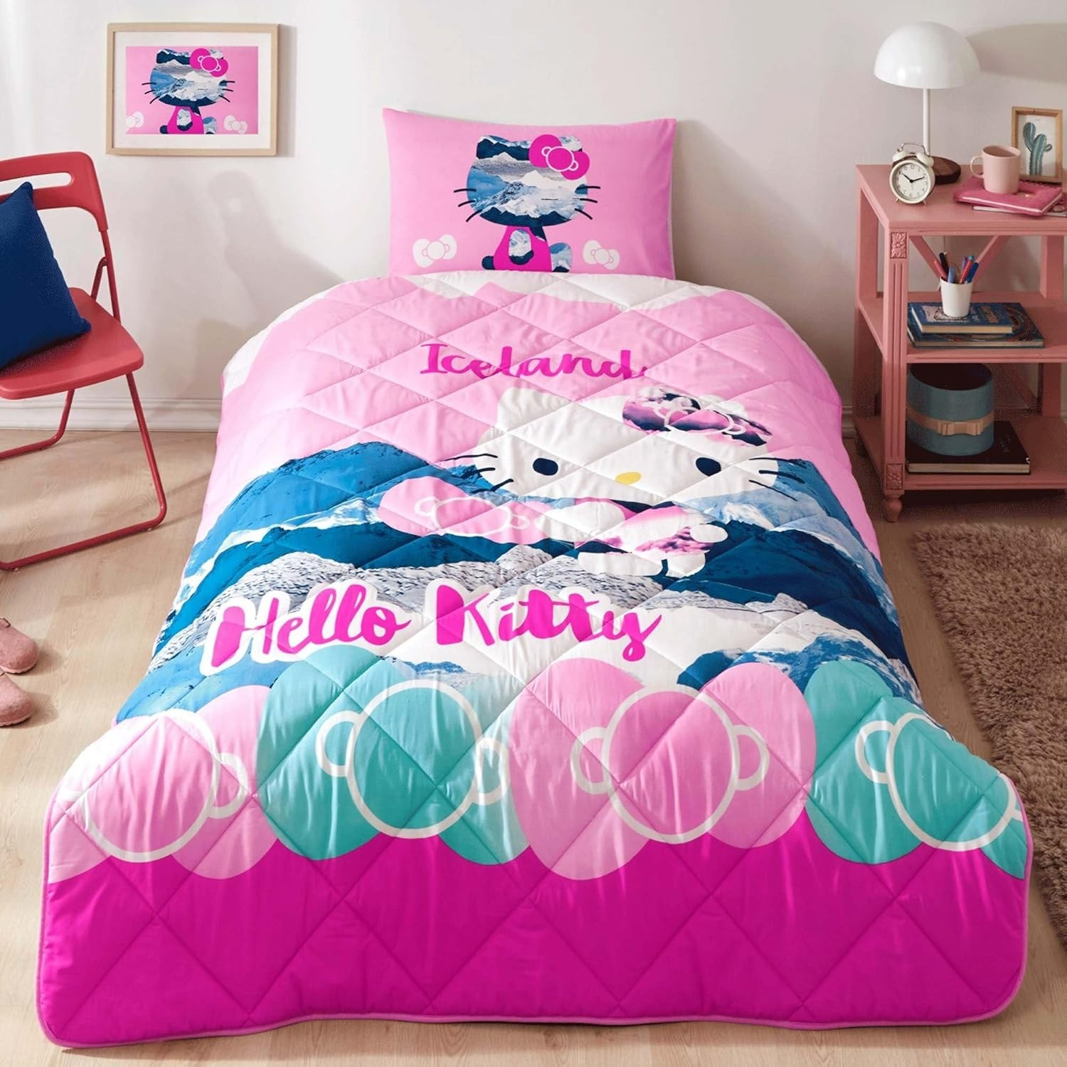HesabımTAÇ Lisanslı Pamuk Hello Kitty Iceland Uyku Seti Tek Kişilik, Çelik Kardeşler VIP farkıyla çocuk ve genç odalarına sevimli bir dokunuş katıyor. Hello Kitty temasıyla lisanslı olarak üretilen bu uyku seti, pamuk kumaşı sayesinde yumuşak ve sağlıklı bir uyku ortamı sunar. Tek kişilik ölçüleriyle yataklara tam uyum sağlar ve eğlenceli tasarımıyla çocukların favorisi olur.